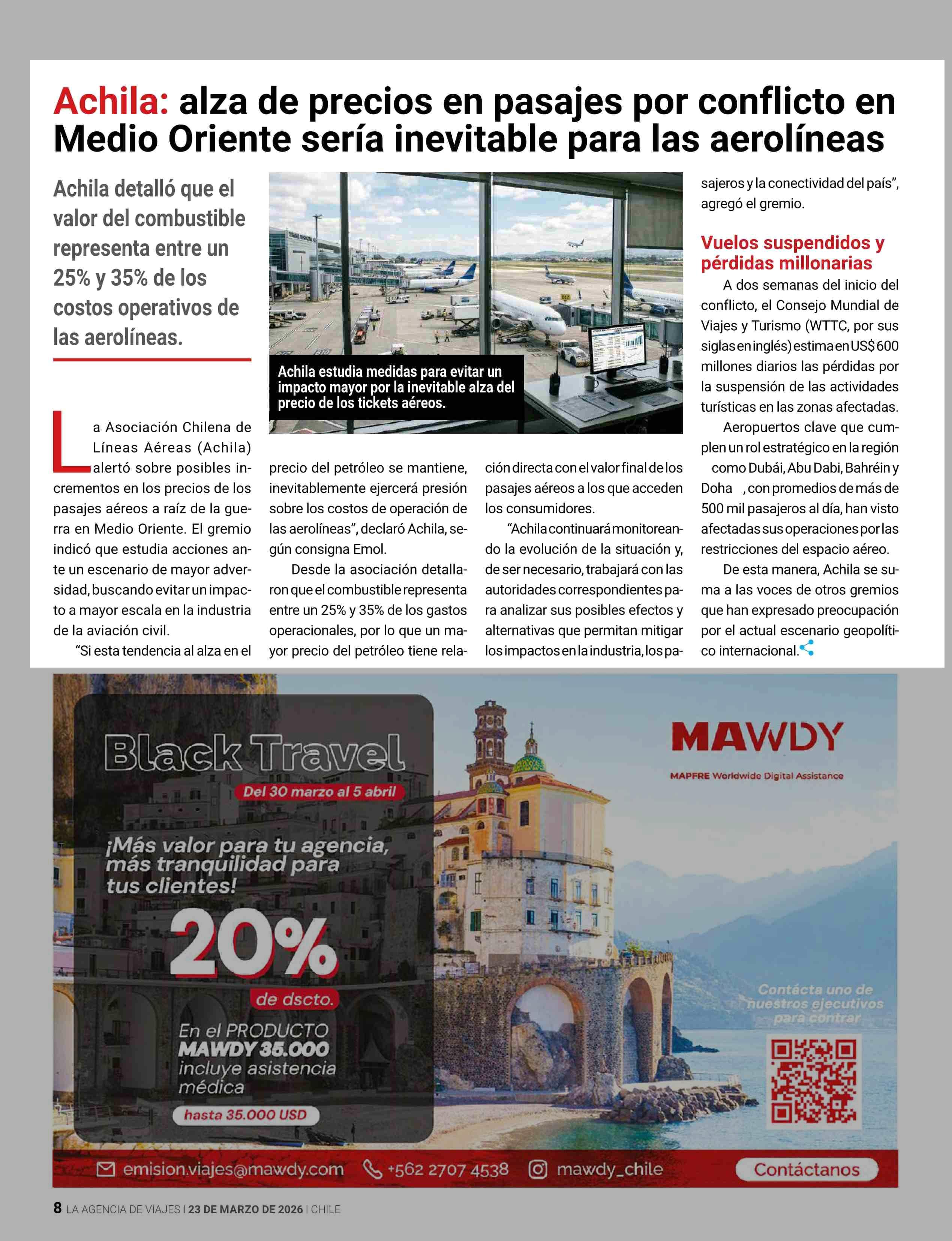 Achila: alza de precios en pasajes por conflicto en Medio Oriente sería inevitable para las aerolíneas 27-03-2026 Revista La Agencia de Viajes |
