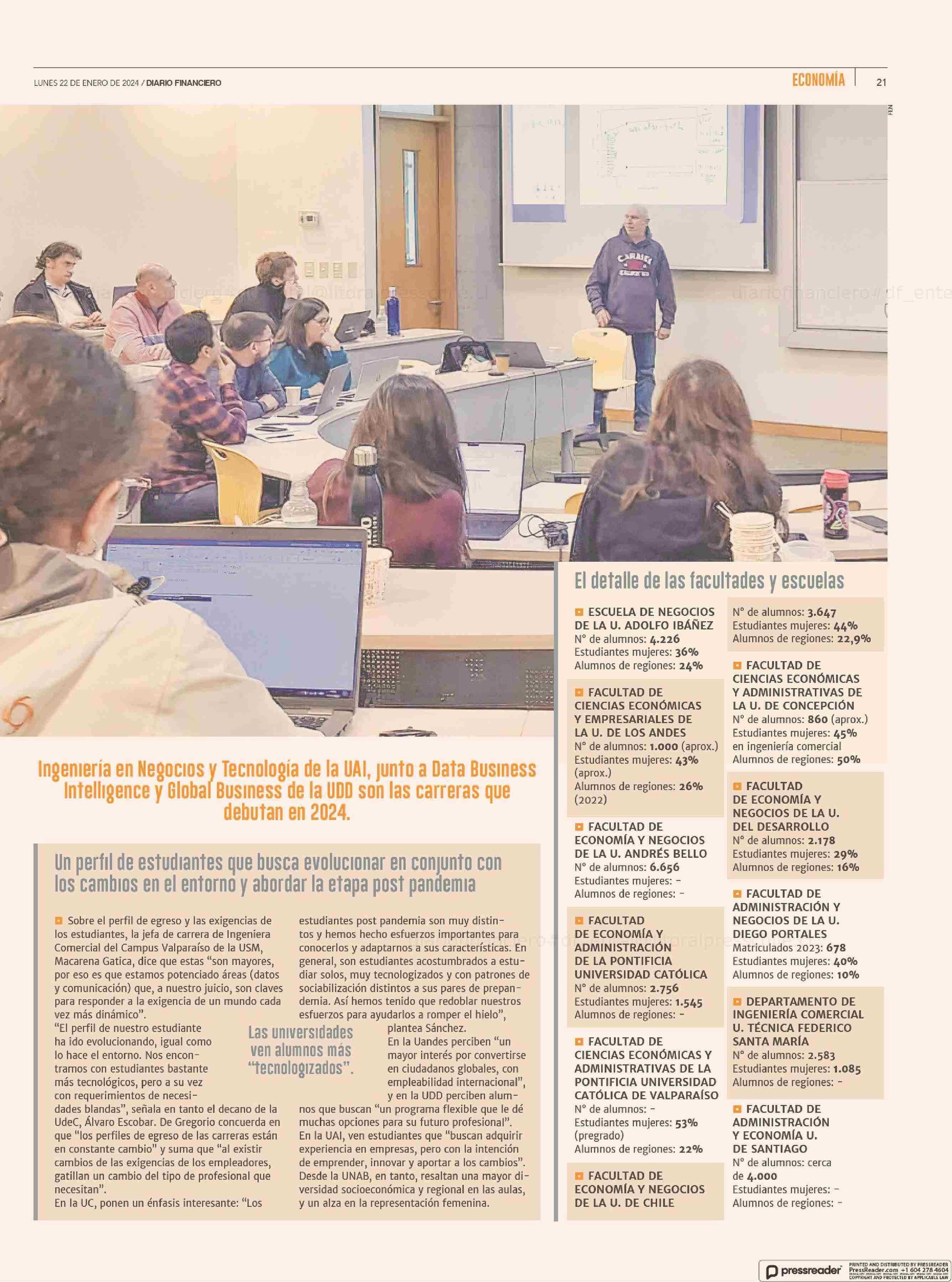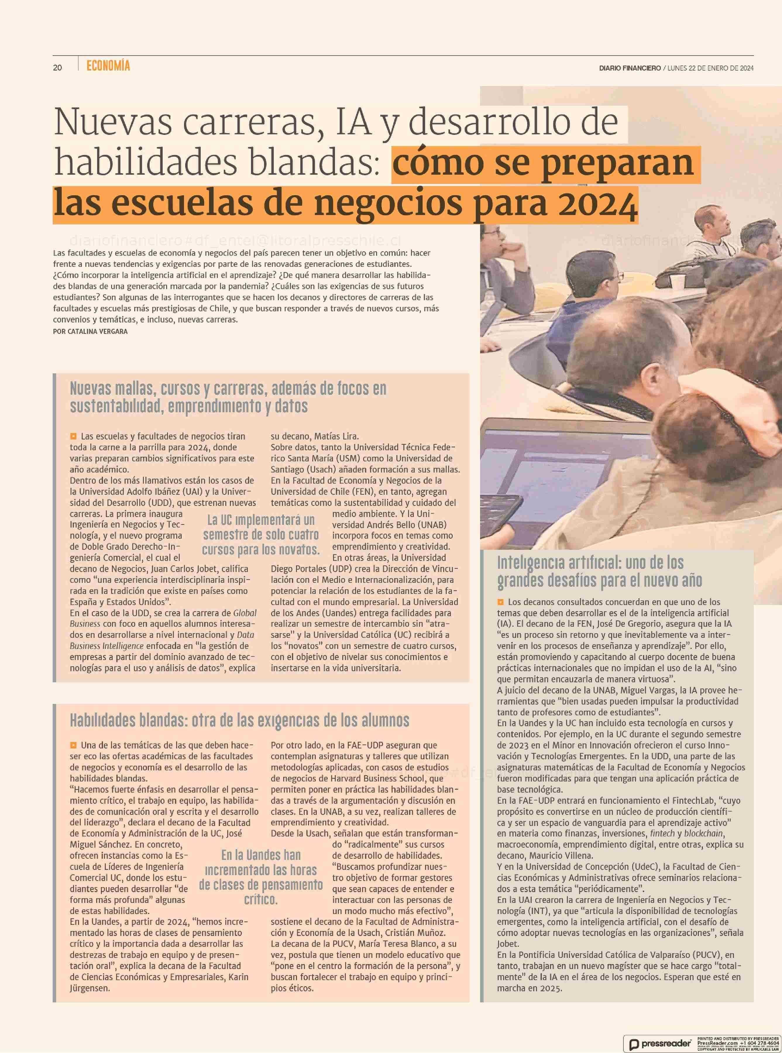 Nuevas carreras, IA y desarrollo de habilidades blandas: cómo se preparan las escuelas de negocios para 2024 22-01-2024 Diario Financiero |