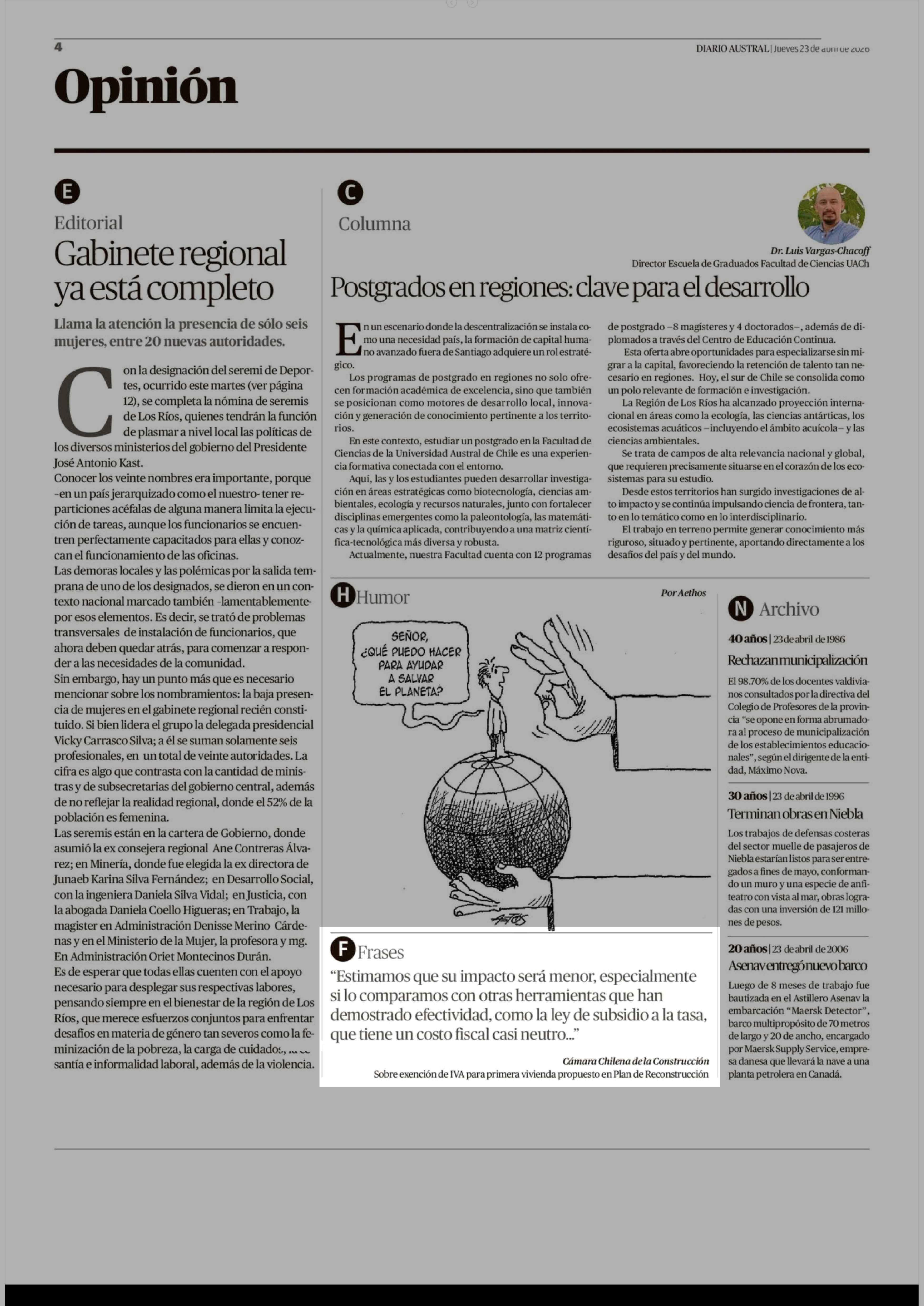 Cámara Chilena de la Construcción Sobre exención de IVA para primera vivienda propuesto en Plan de Reconstrucción 23-04-2026 Diario Austral Región de Los Ríos |