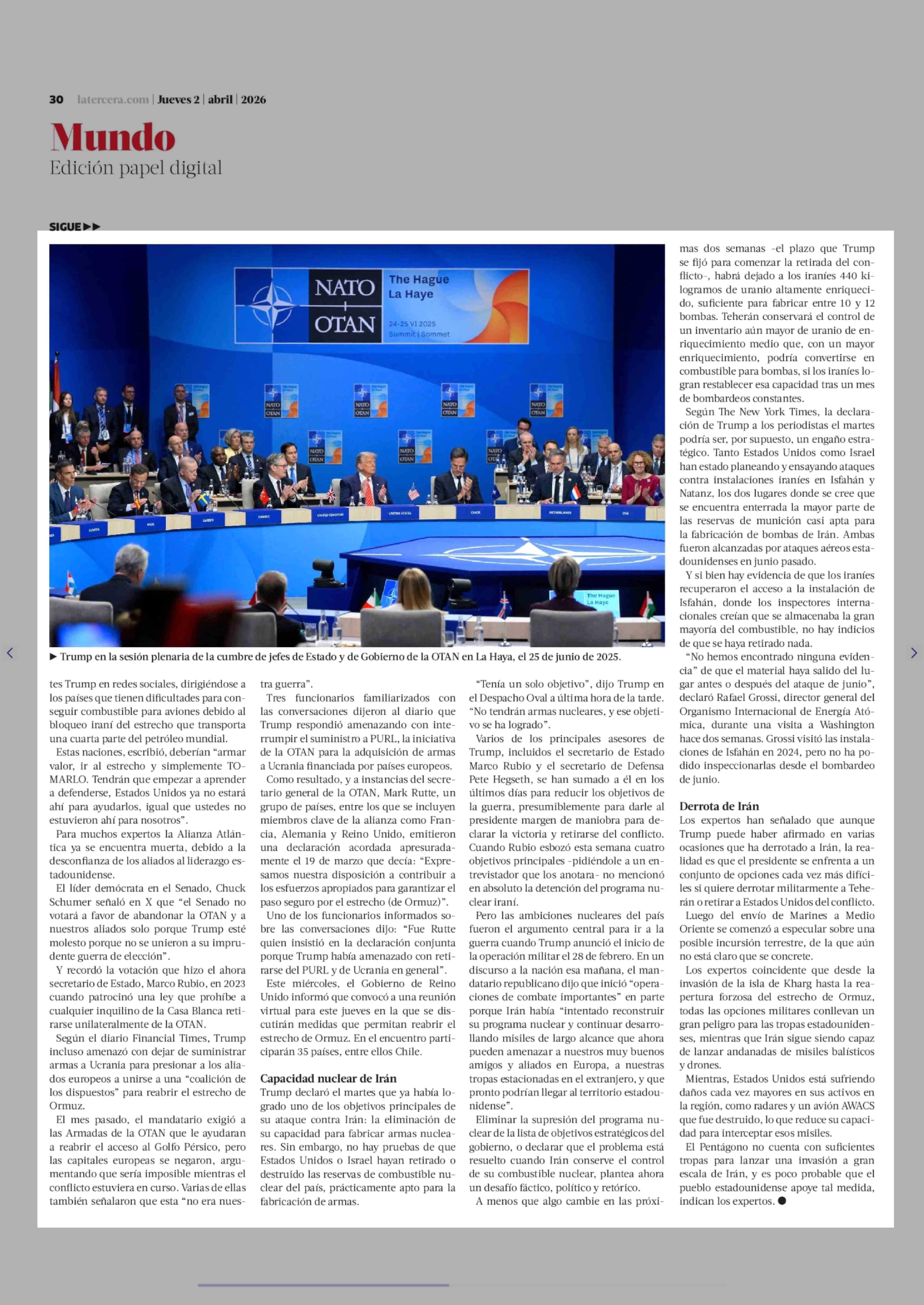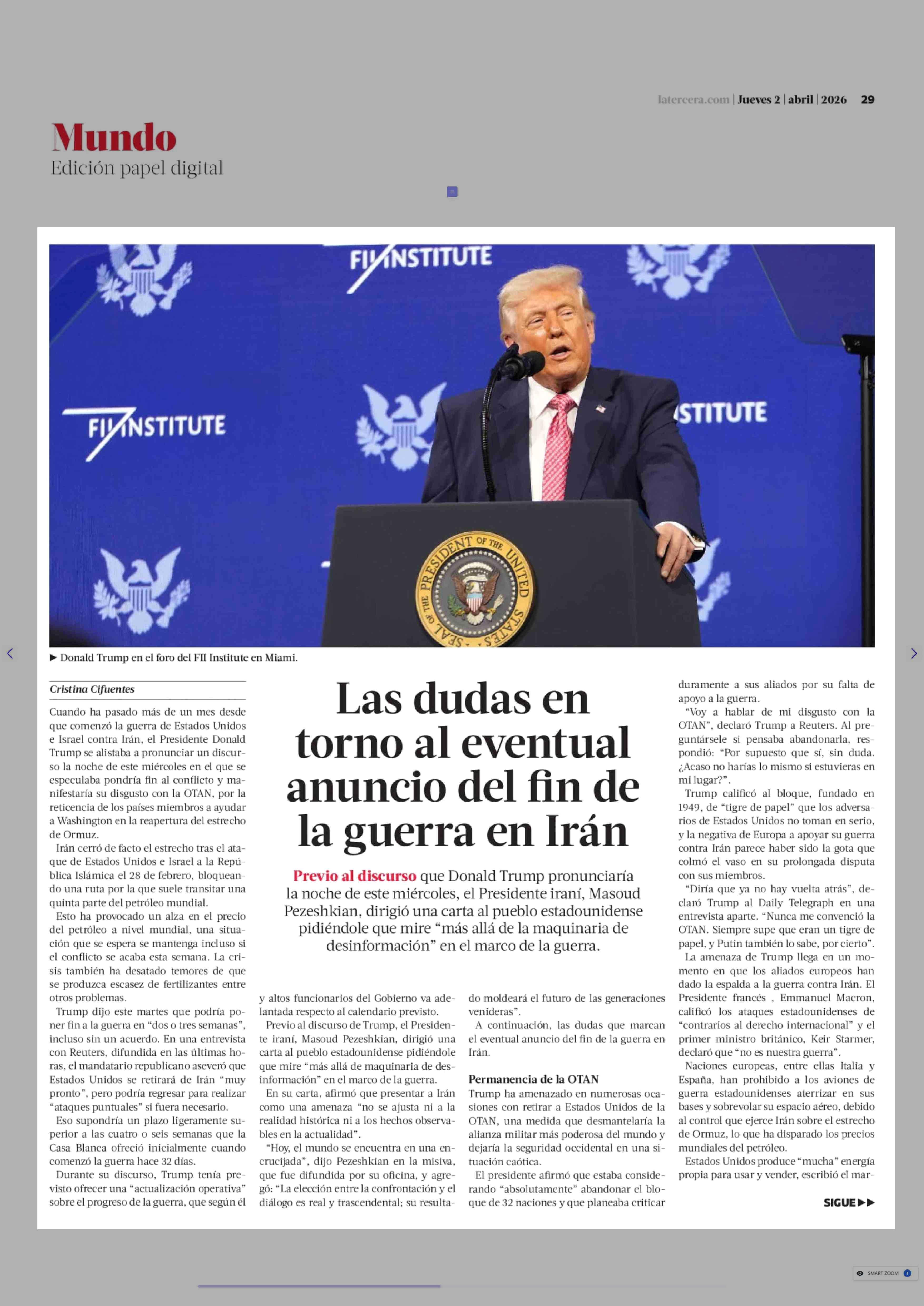 Las dudas en torno al eventual anuncio del fin de la guerra en Irán 02-04-2026 La Tercera |