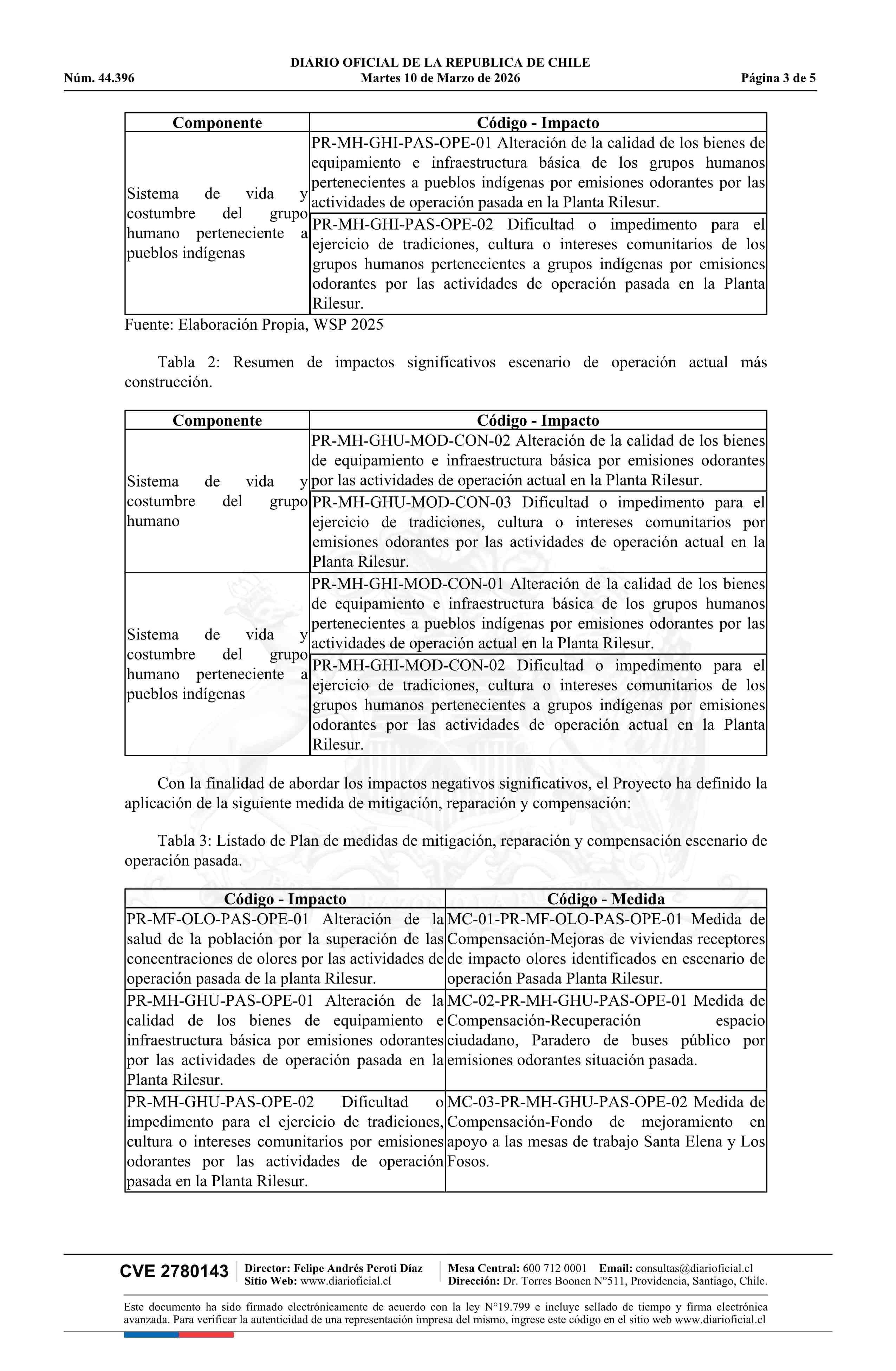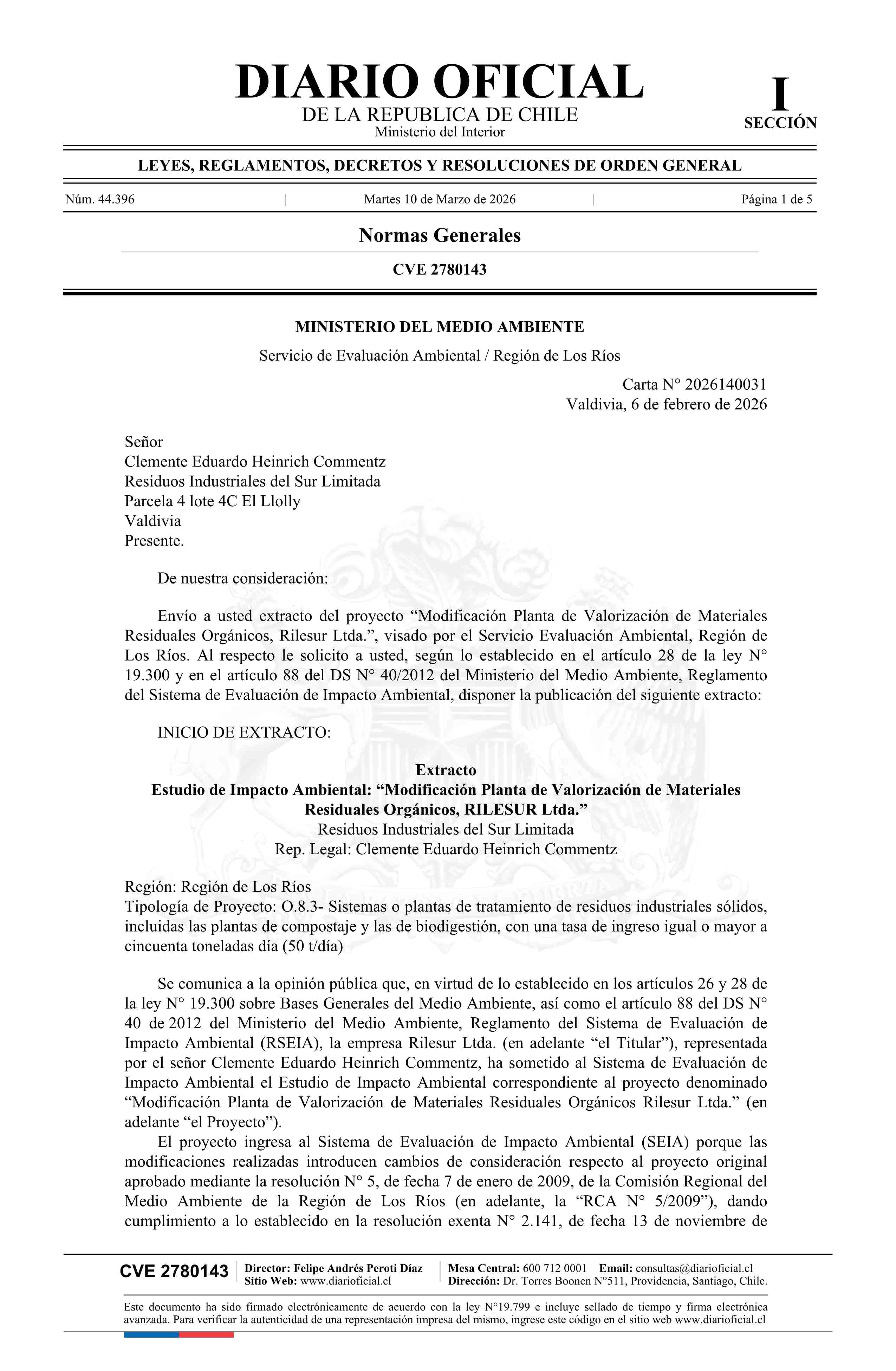 Extracto de Estudio de Impacto Ambiental del proyecto Modificación Planta de Valorización de Materiales Residuales Orgánicos, Rilesur Ltda.