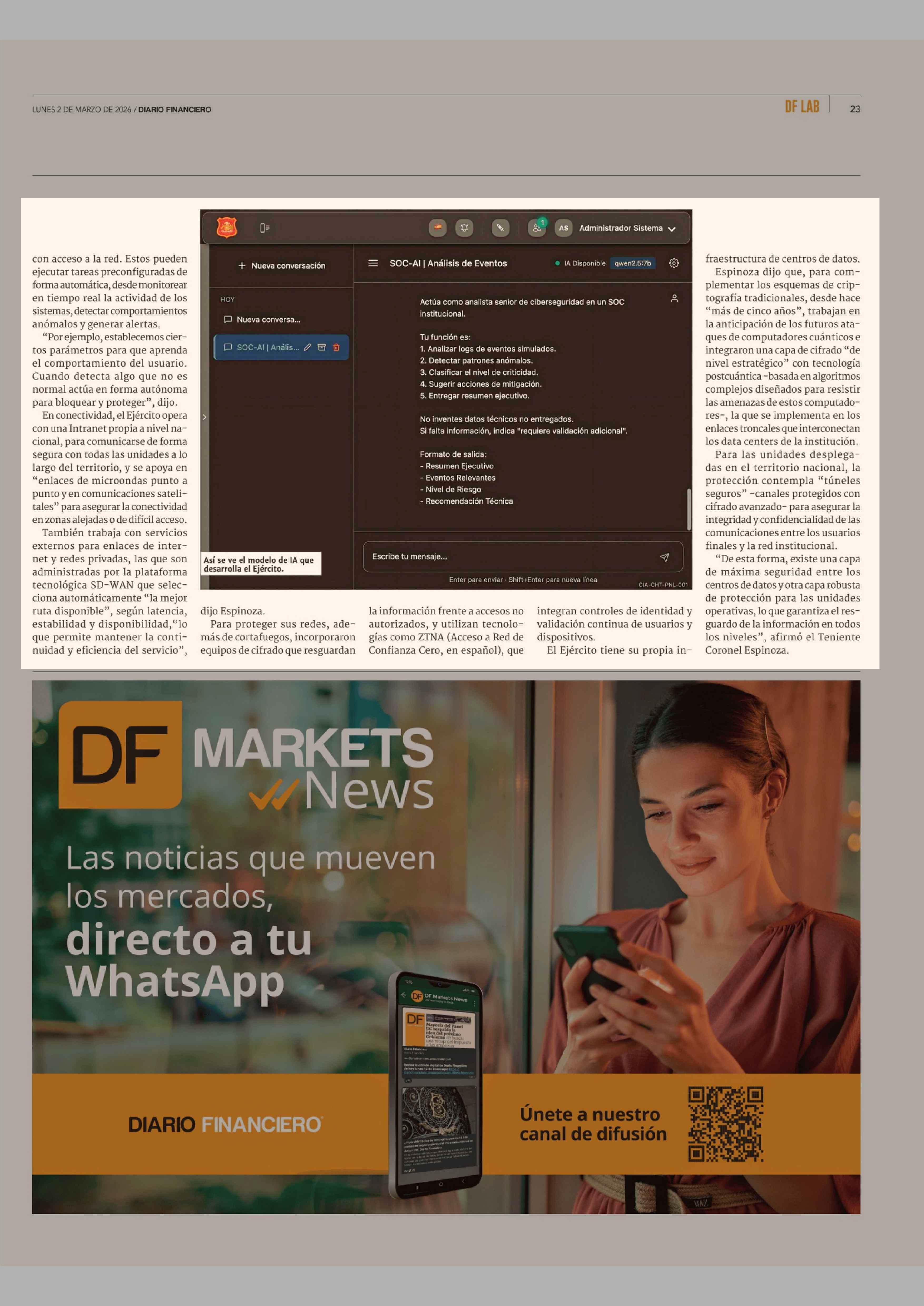 Cómo avanza el Ejército en ciberseguridad con redes seguras, sistemas de protección con IA y cifrado postcuántico 02-03-2026 Diario Financiero |