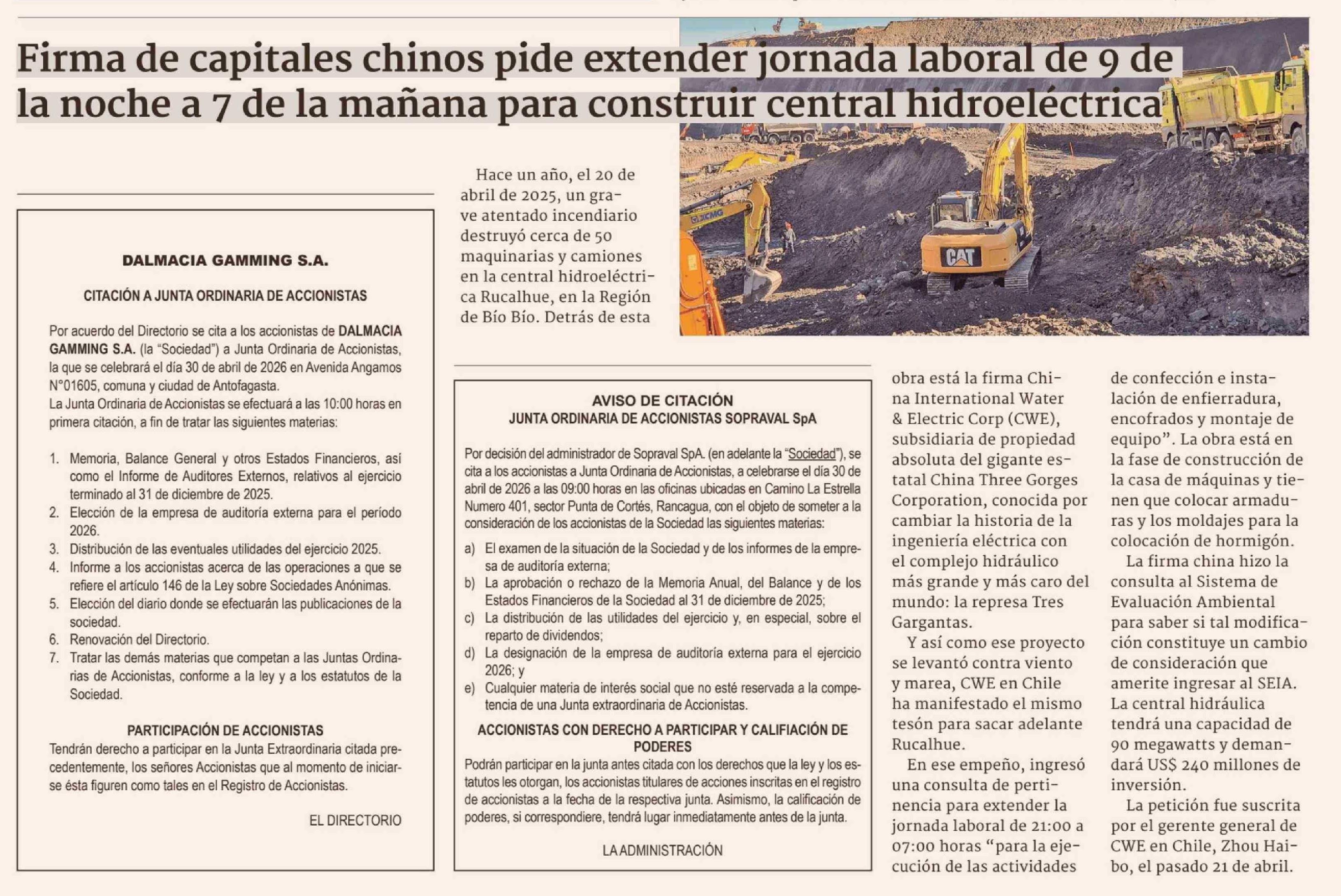 Firma de capitales chinos pide extender jornada laboral de 9 de la noche a 7 de la mañana para construir central hidroeléctrica 27-04-2026 Diario Financiero |