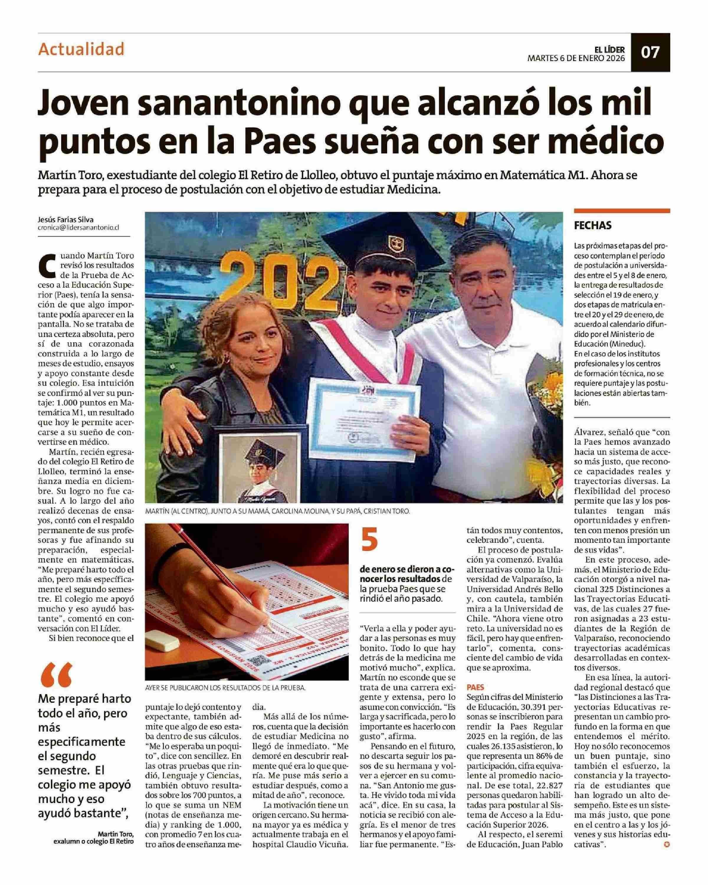 Joven sanantonino que alcanzó los mil puntos en la Paes sueña con ser médico 06-01-2026 El Líder |
