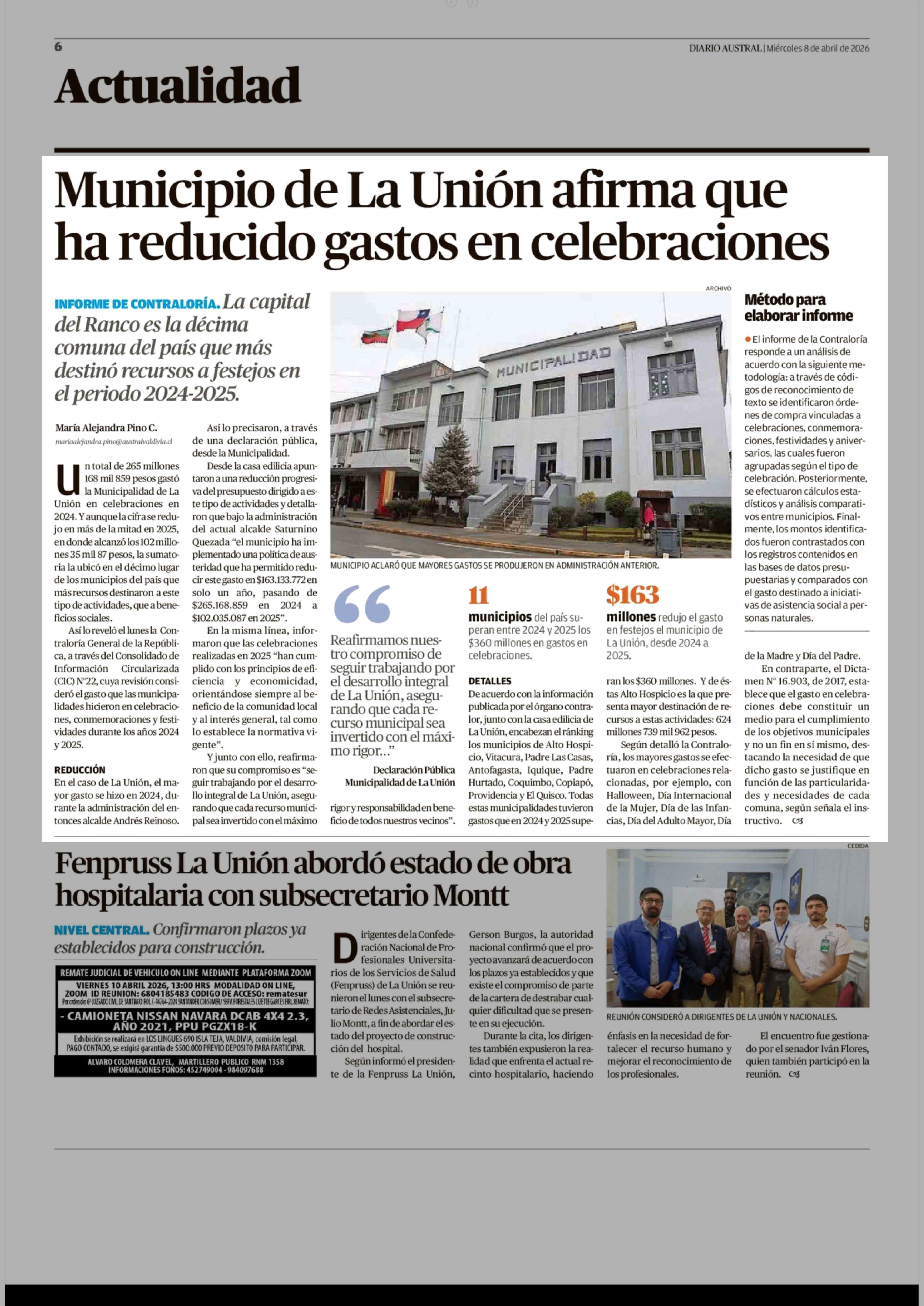 Municipio de La Unión afirma que ha reducido gastos en celebraciones 08-04-2026 Diario Austral Región de Los Ríos |