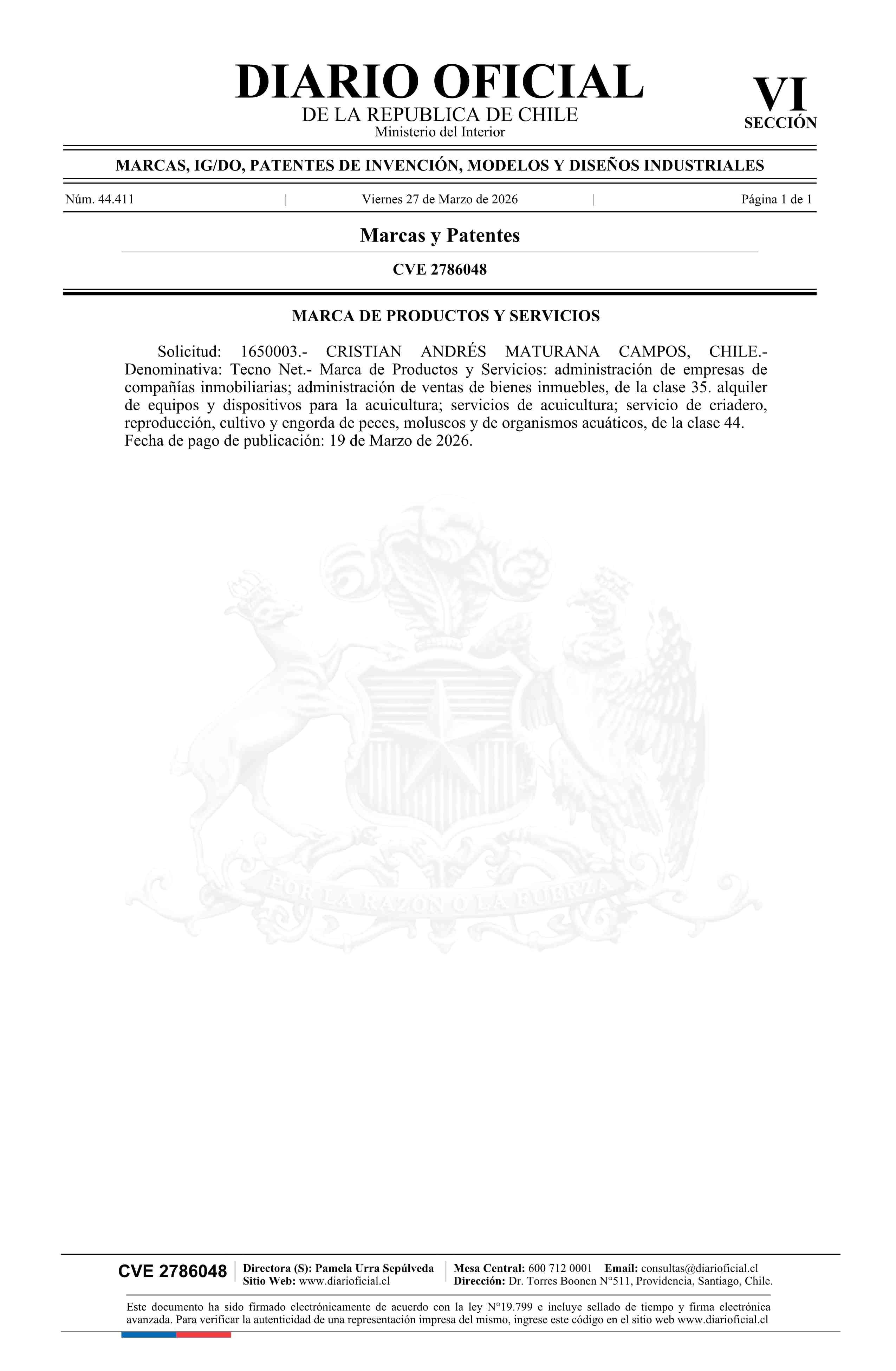 Solicitud número 1650003.- Tecno Net 27-03-2026 Diario Oficial Edición Electrónica |
