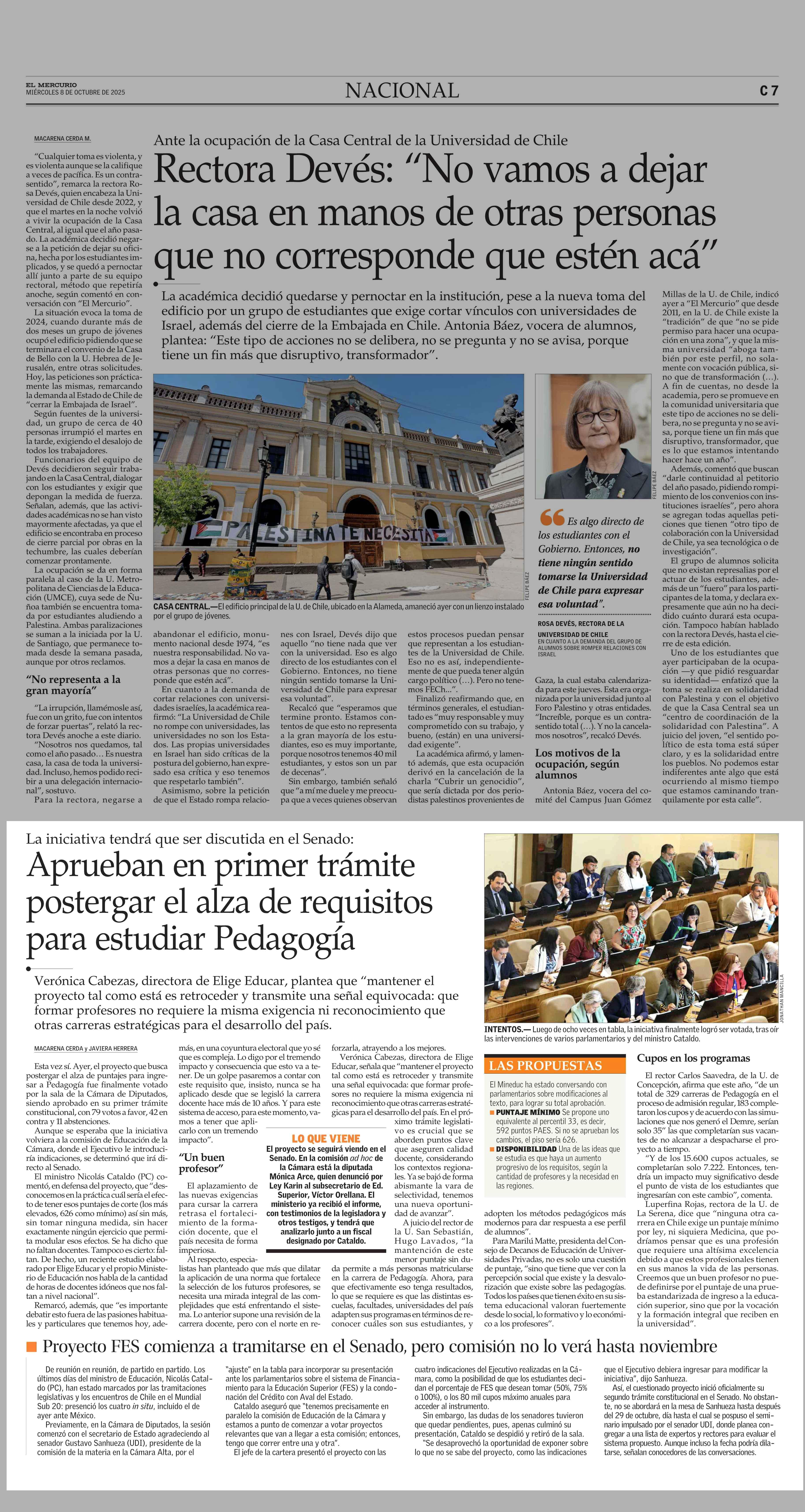 Aprueban en primer trámite postergar el alza de requisitos para estudiar Pedagogía 08-10-2025 El Mercurio |