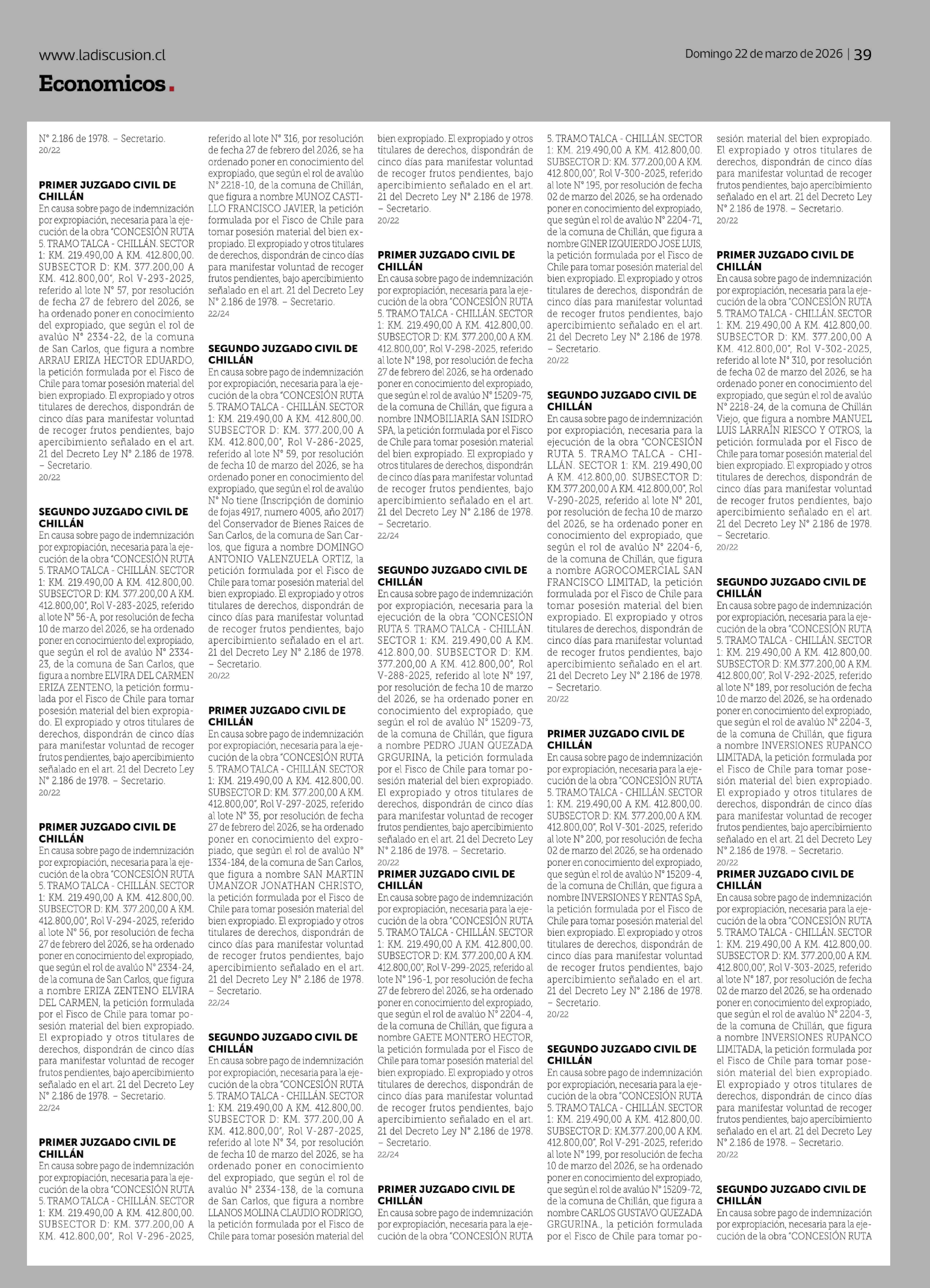 frutos pendientes, bajo apercibimiento señalado en el art. 21 del Decreto Ley Nº 2.186 de 1978. - Secretario. 20/22