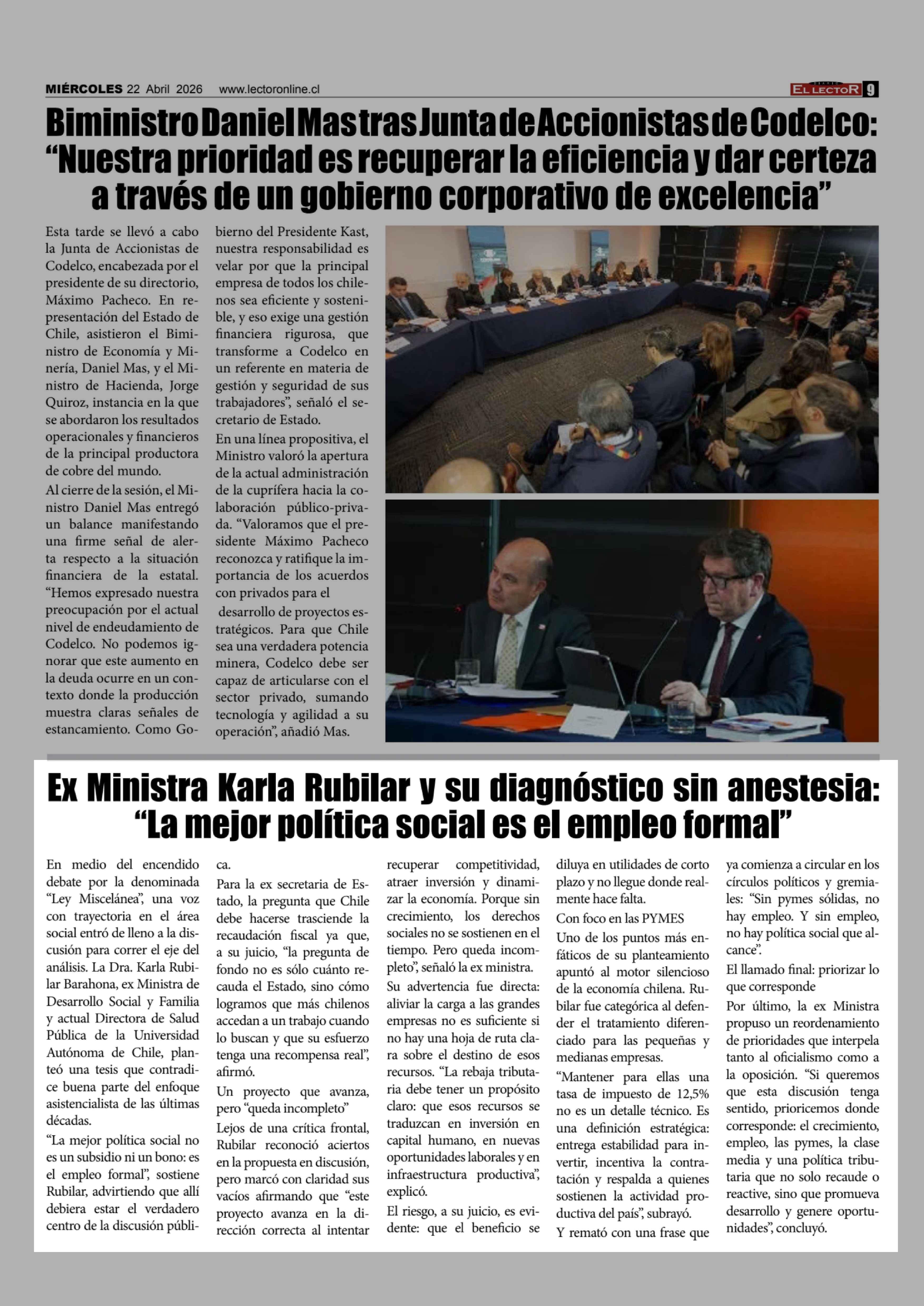 Ex Ministra Karla Rubilar y su diagnóstico sin anestesia: "La mejor política social es el empleo formal" 23-04-2026 El Lector |