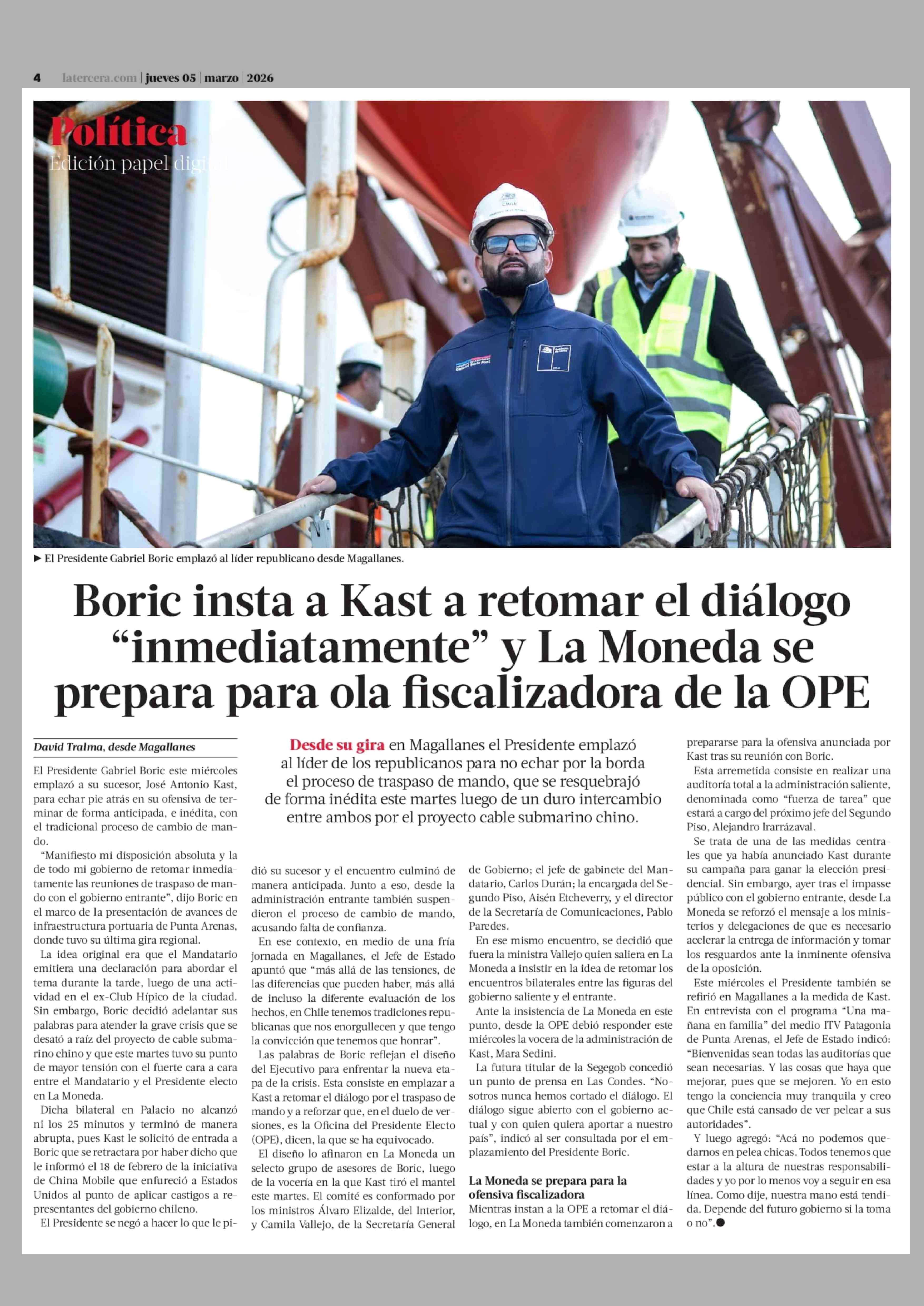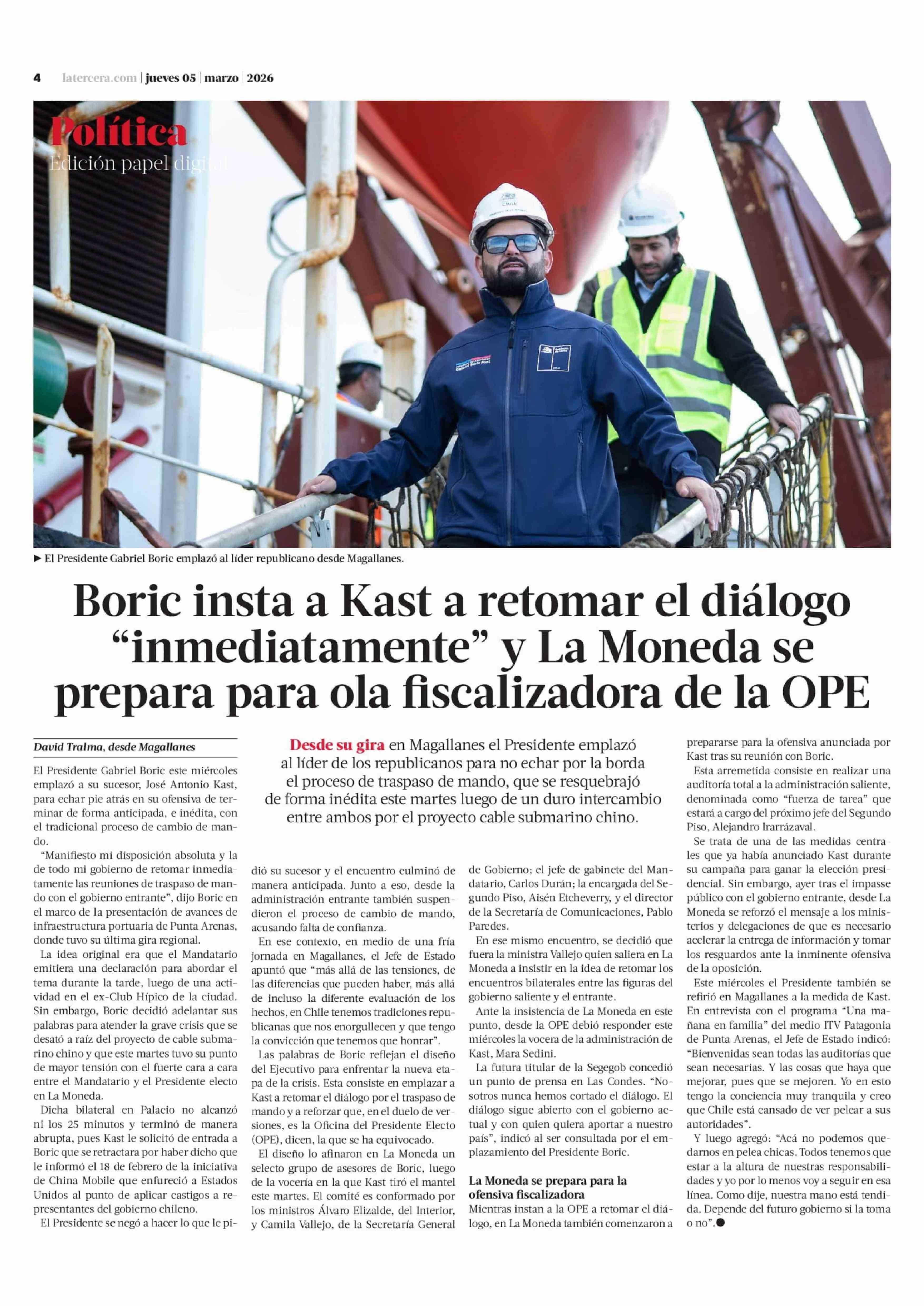 Título: Boric insta a Kast a retomar el diálogo "inmediatamente" y La Moneda se prepara para ola fiscalizadora de la OPE