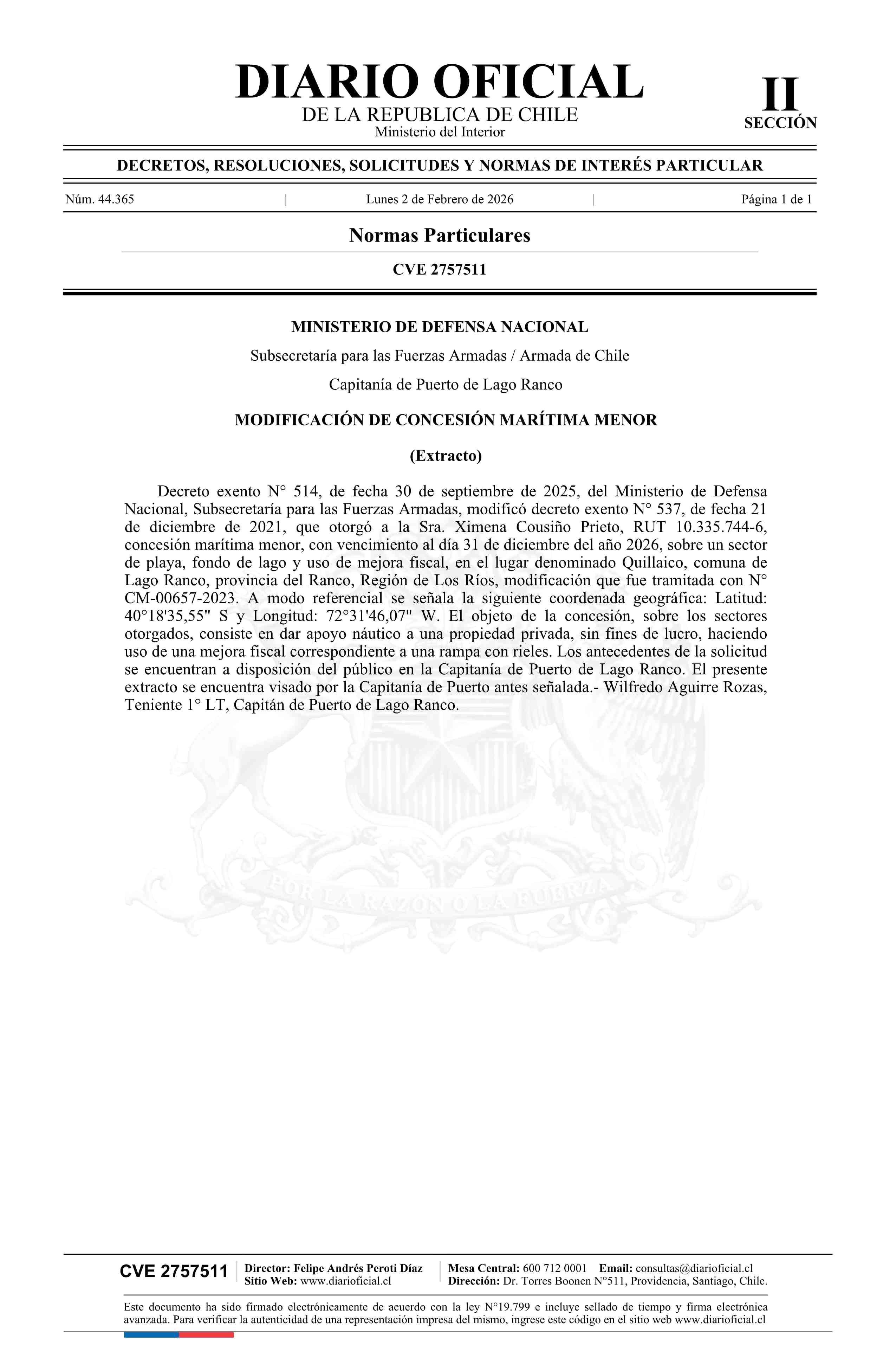Extracto de decreto exento número 514, de 2025.- Modificación de concesión marítima menor 02-02-2026 Diario Oficial Edición Electrónica |