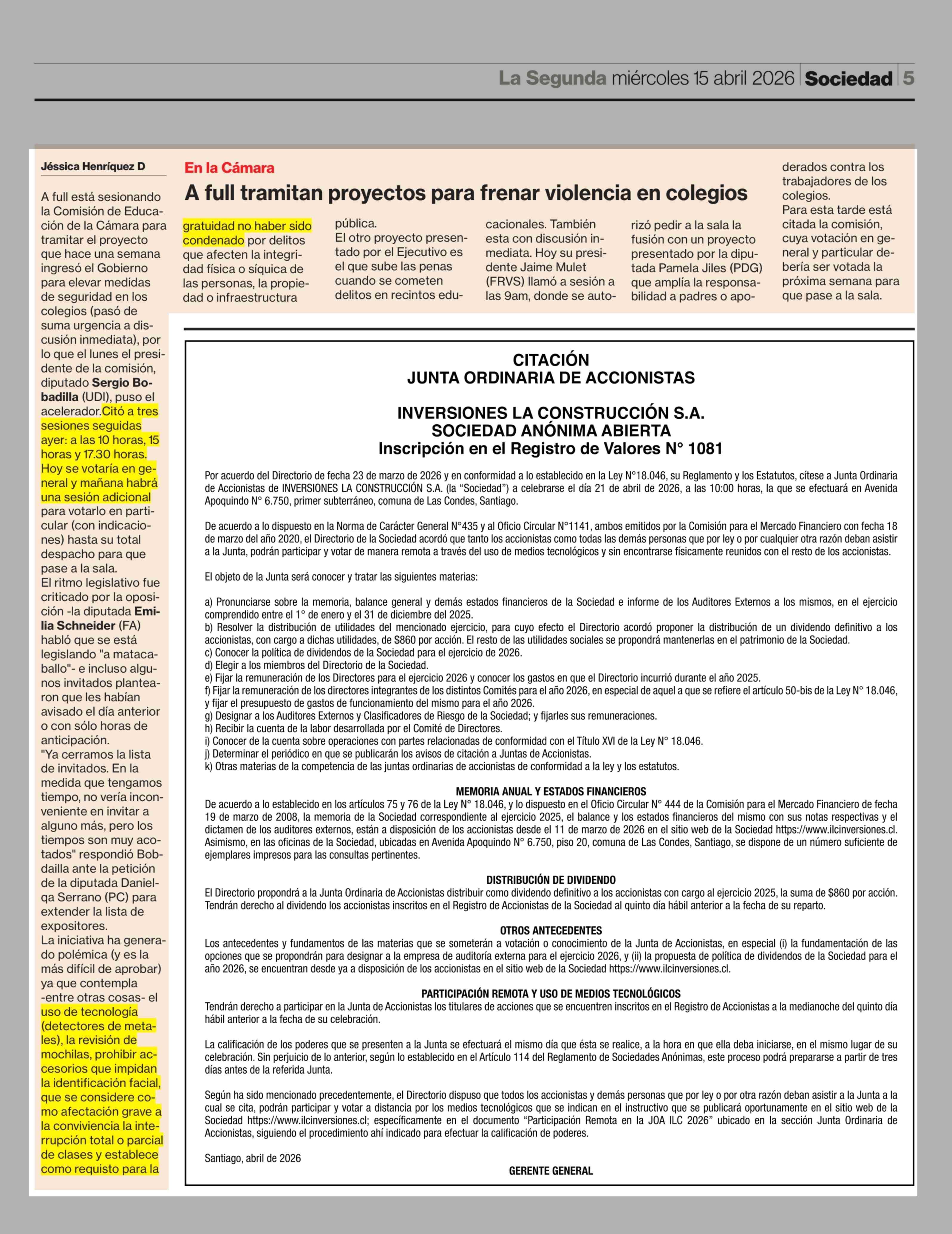 Fecha: 15-04-2026 Sector: Noticia general Región: Región Metropolitana de Santiago