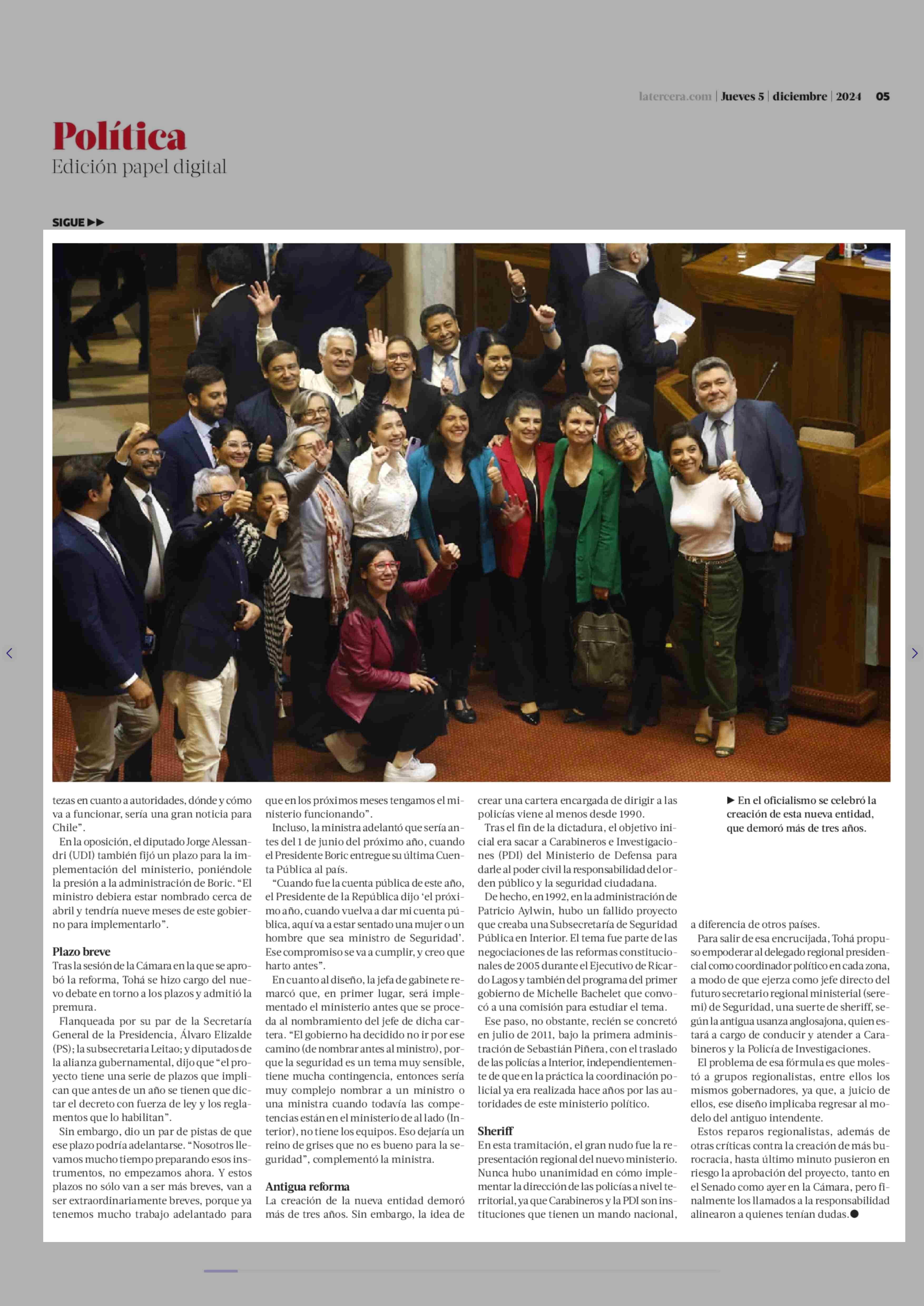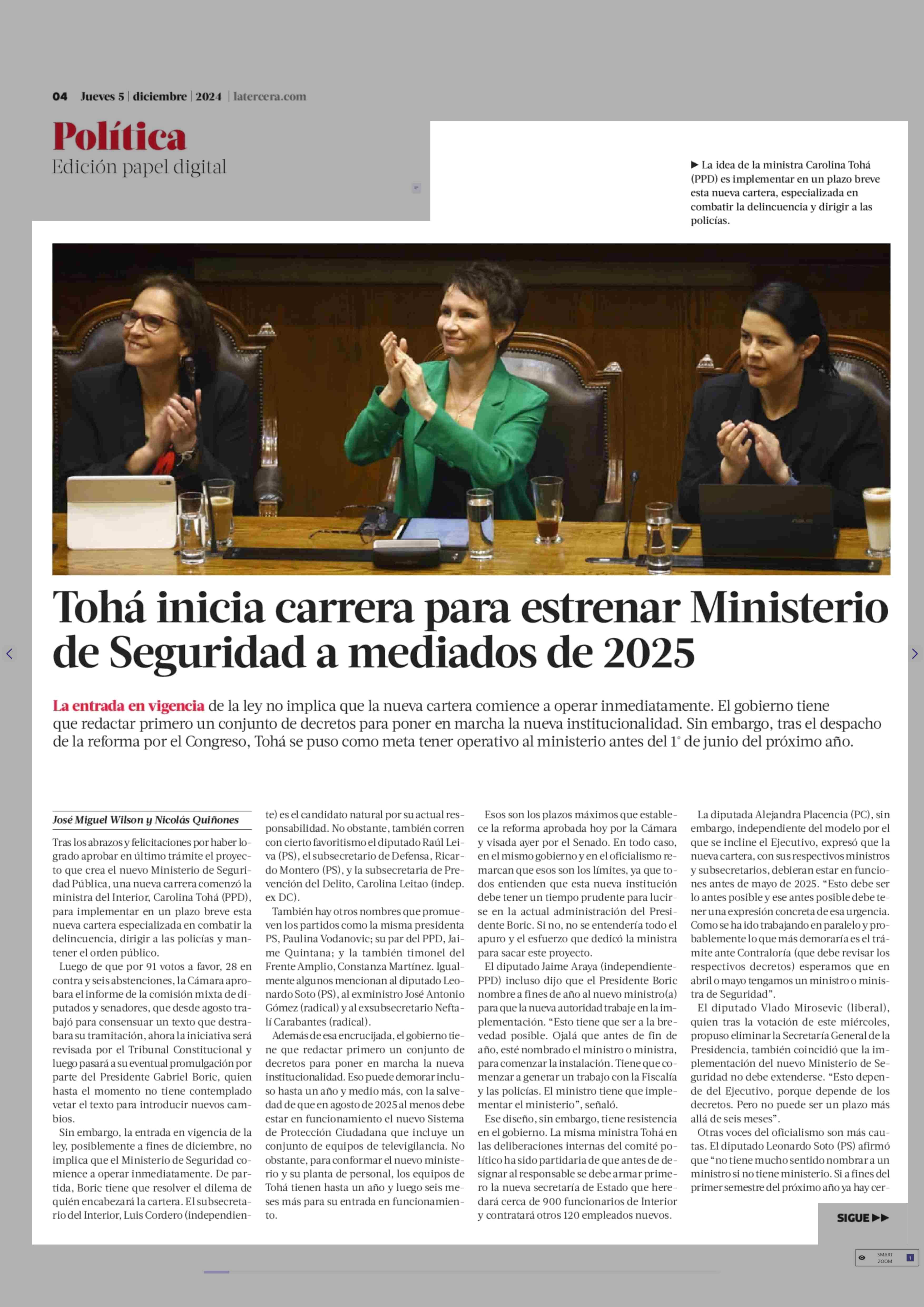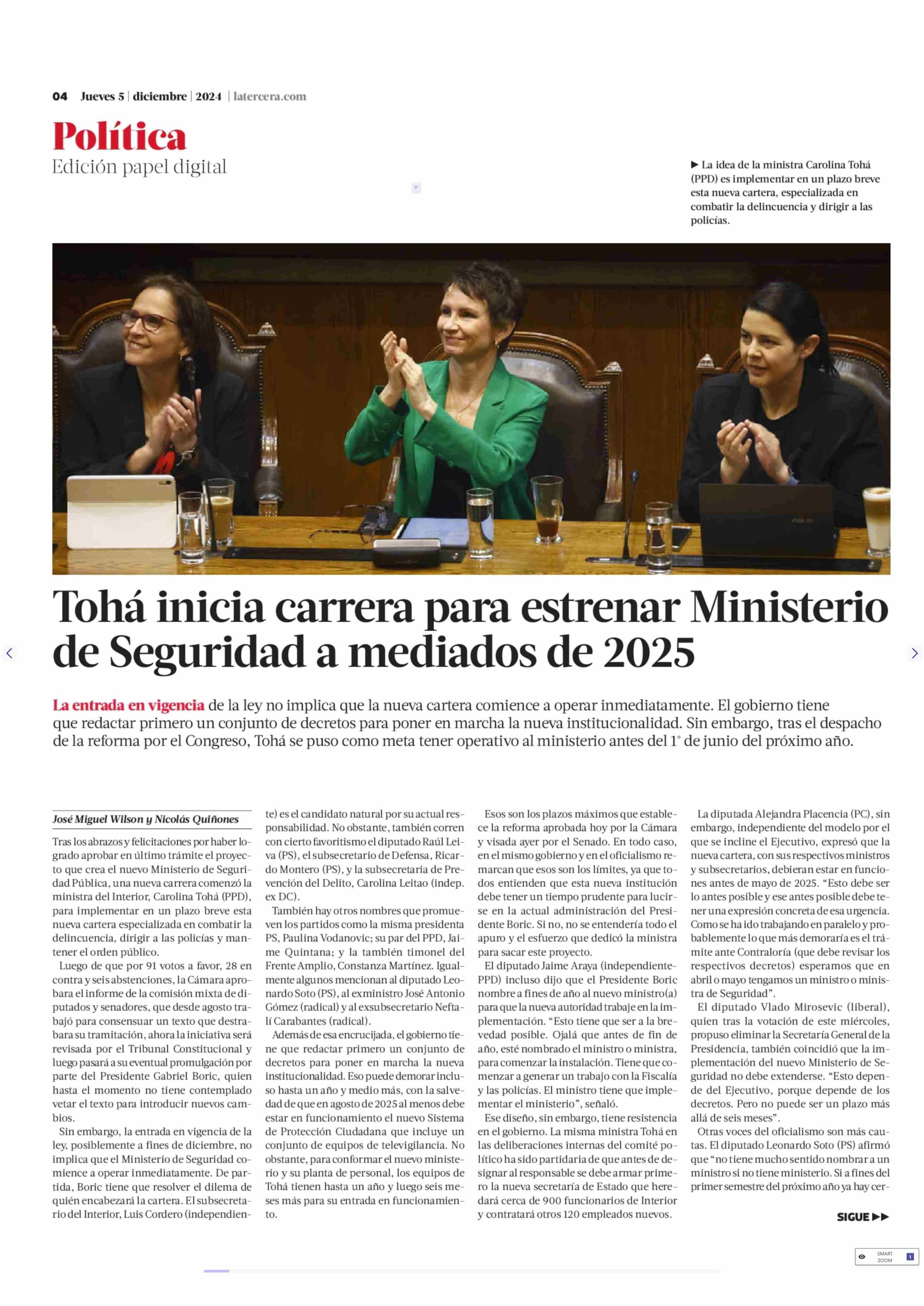 Tohá inicia carrera para estrenar Ministerio de Seguridad a mediados de 2025 05-12-2024 La Tercera |