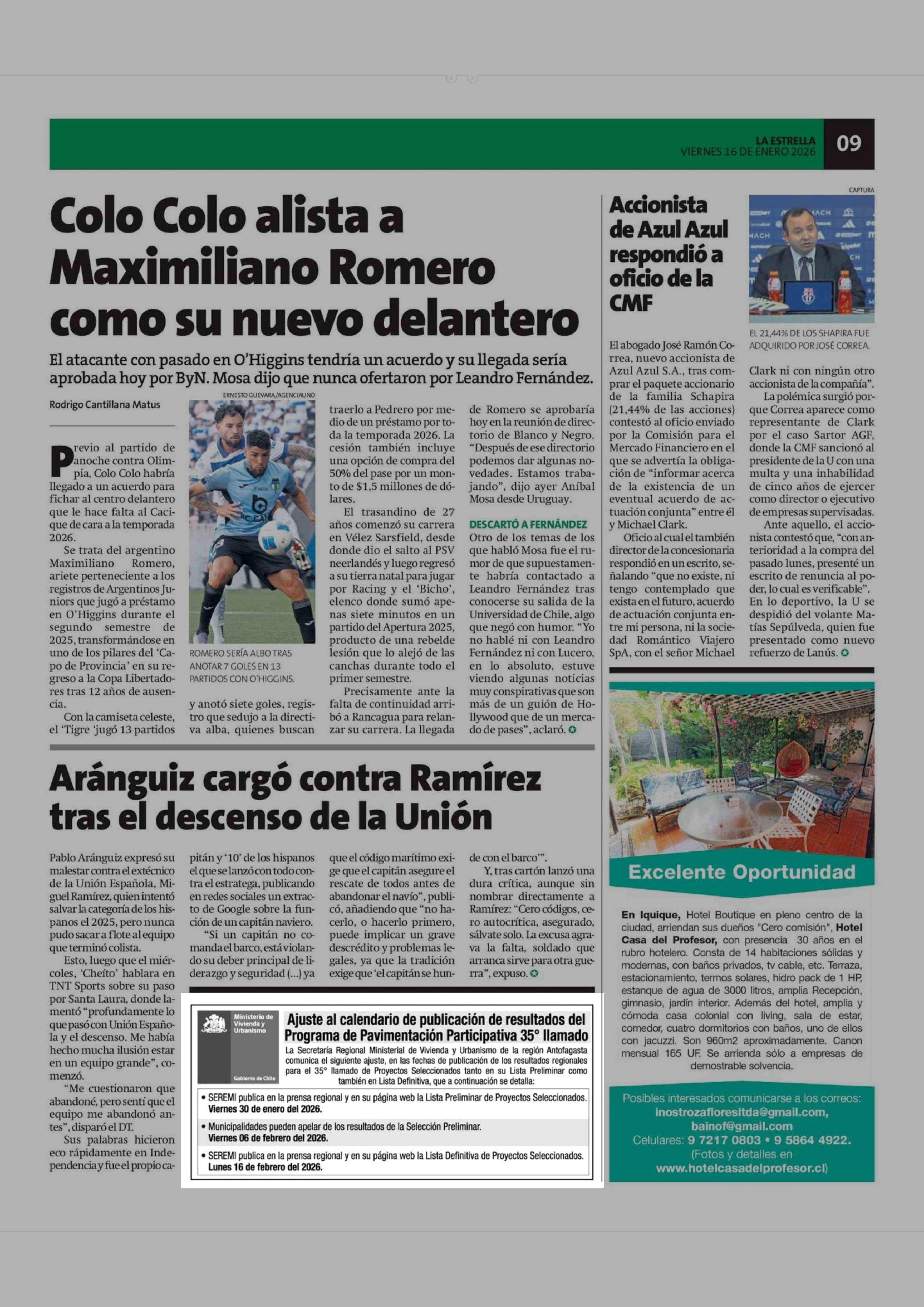 Aviso Publicitario: Ajuste al calendario de publicación de resultados del Programa de Pavimentación Participativa 35° llamado 16-01-2026 La Estrella de Antofagasta |