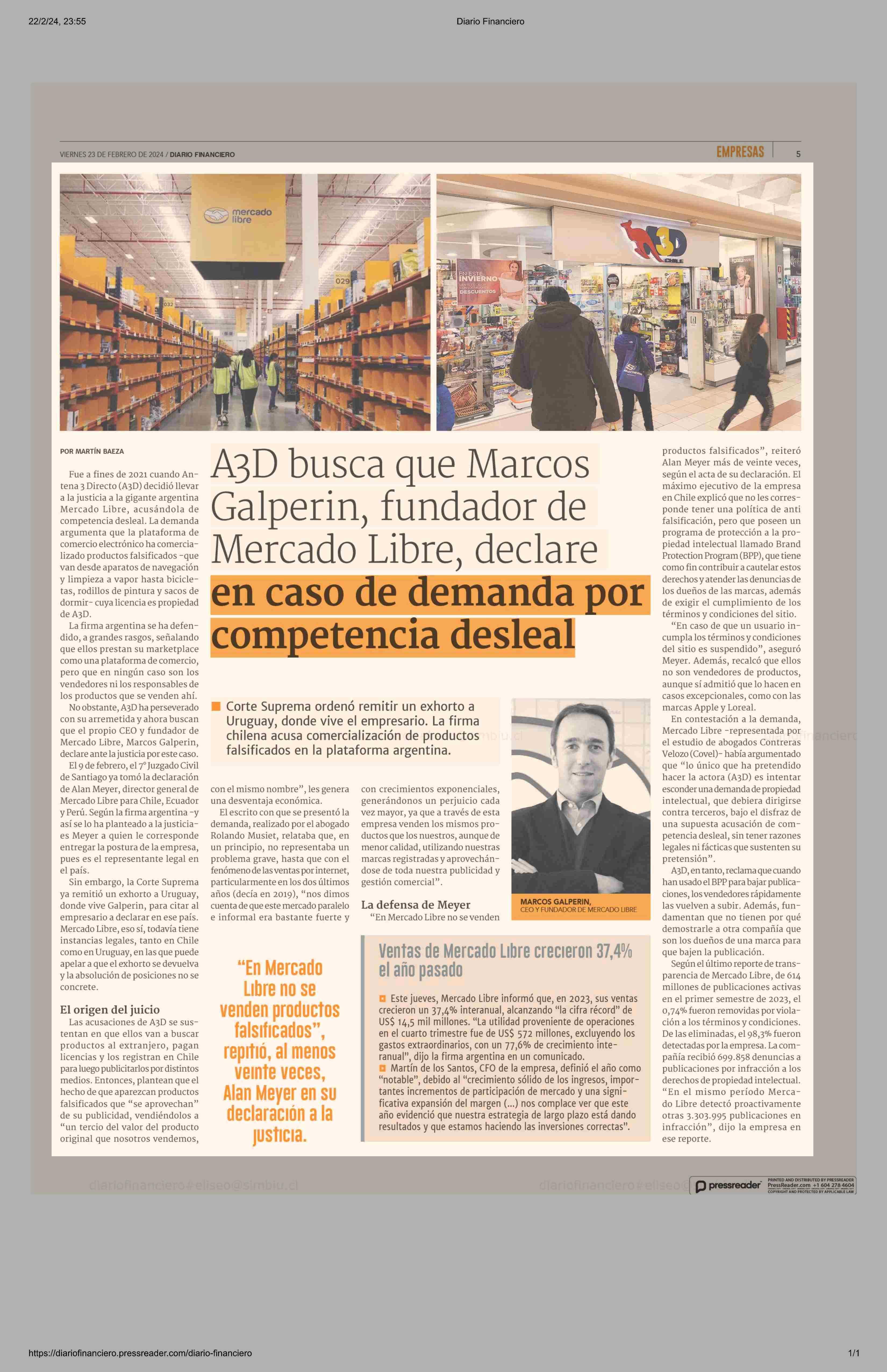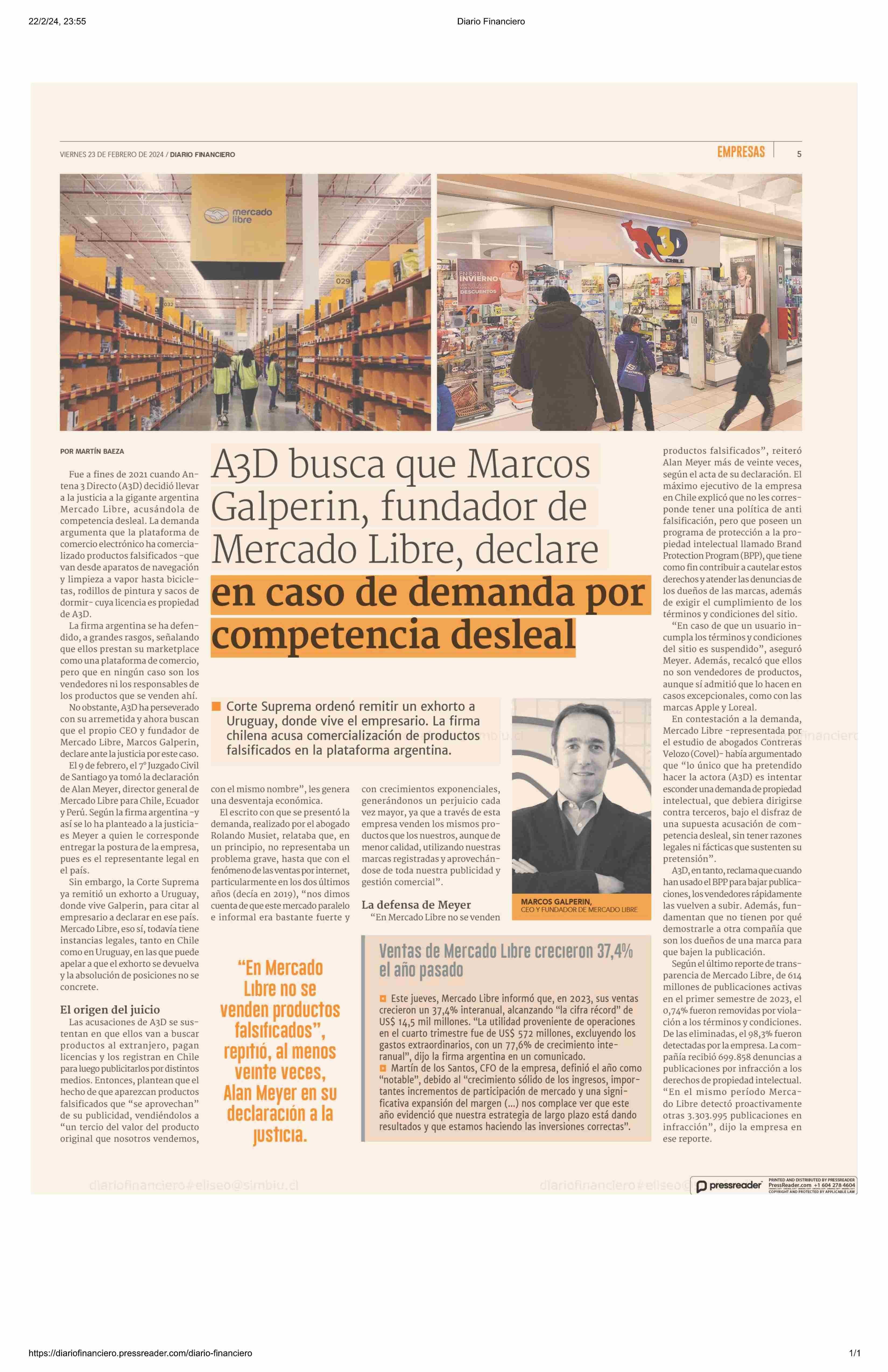 A3D busca que Marcos Galperin, fundador de Mercado Libre, declare en caso de demanda por competencia desleal 23-02-2024 Diario Financiero |