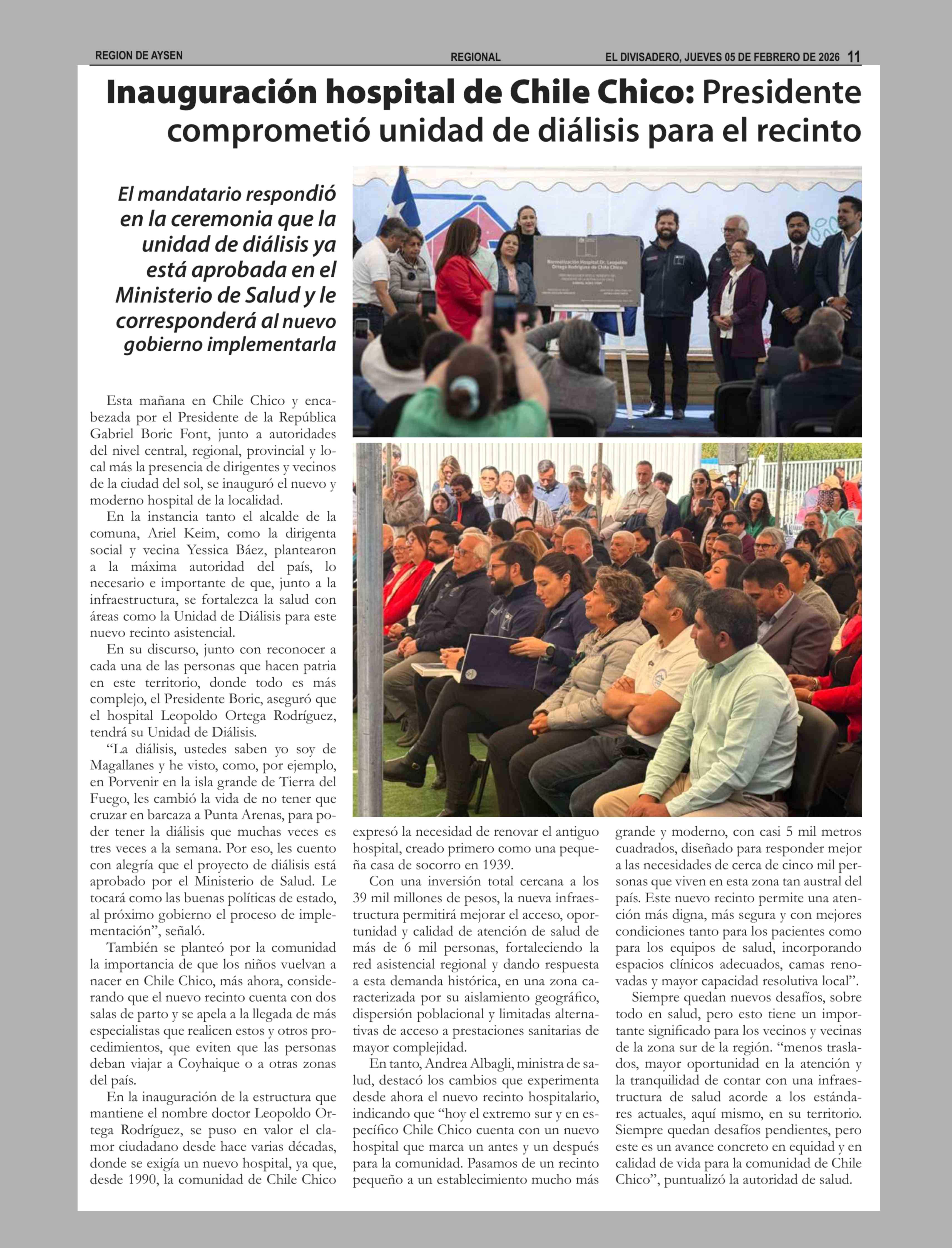 Inauguración hospital de Chile Chico: Presidente comprometió unidad de diálisis para el recinto 05-02-2026 El Divisadero |