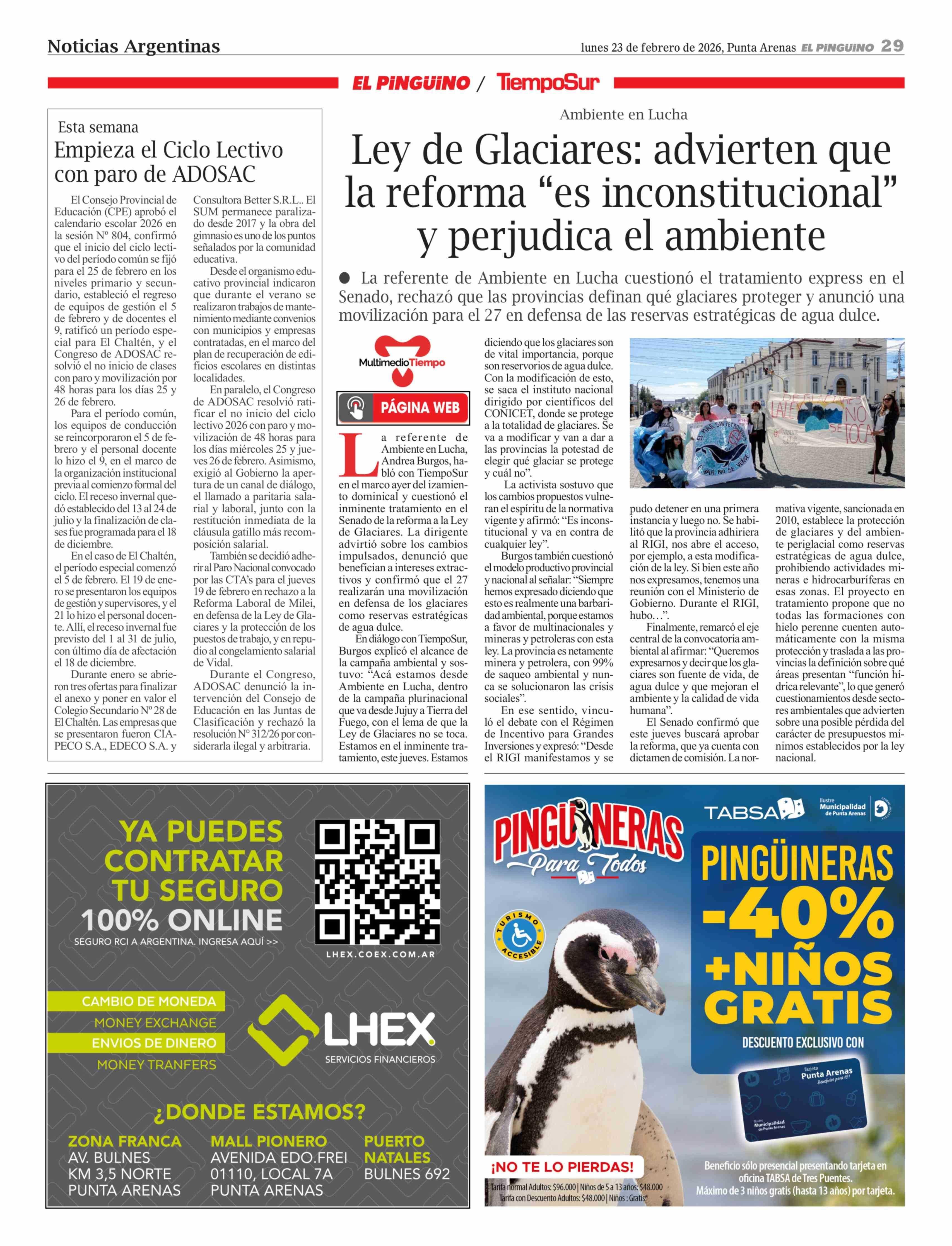 Ley de Glaciares: advierten que la reforma "es inconstitucional" y perjudica el ambiente 23-02-2026 El Pingüino |