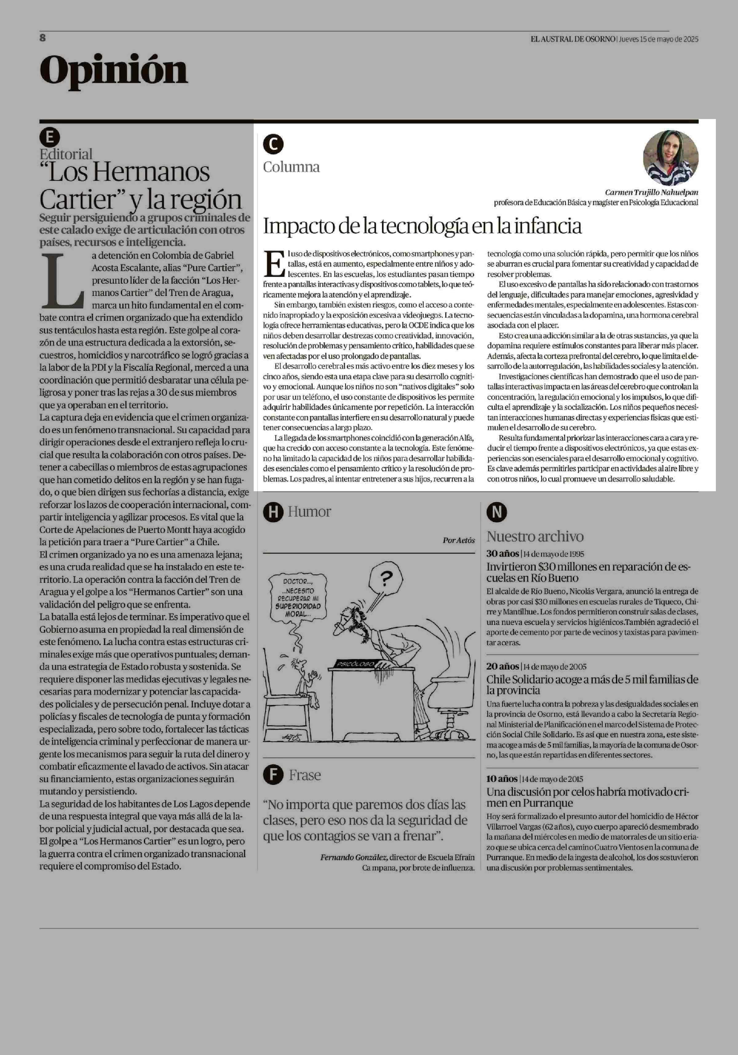 Impacto de la tecnología en la infancia 15-05-2025 El Austral de Osorno |
