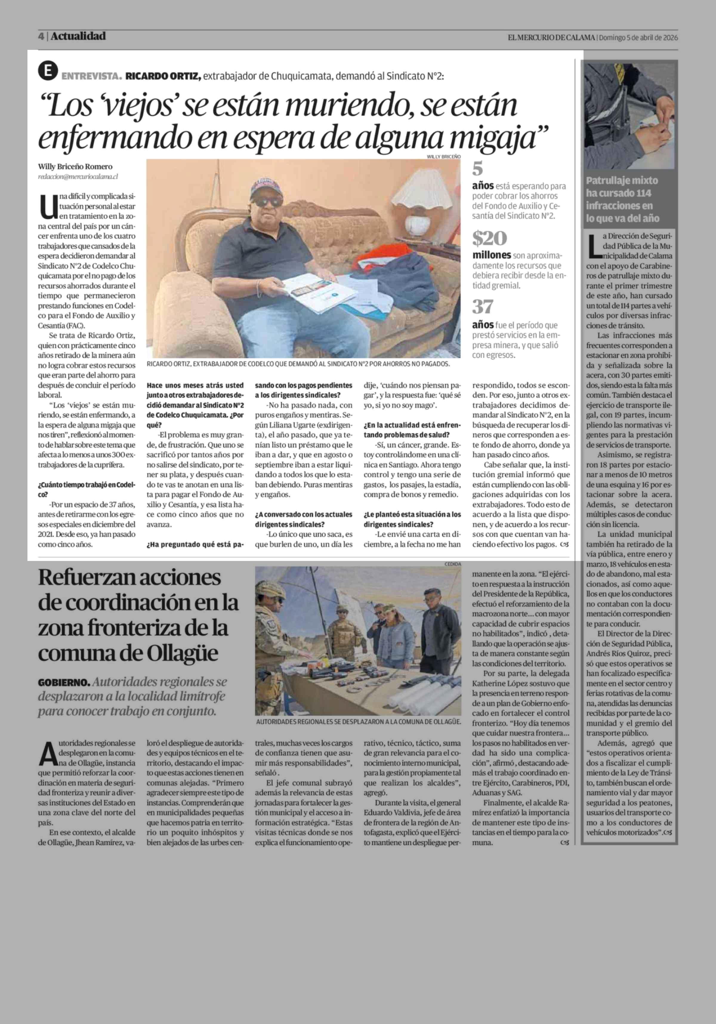 "Los 'viejos' se están muriendo, se están enfermando en espera de alguna migaja" 05-04-2026 El Mercurio de Calama |