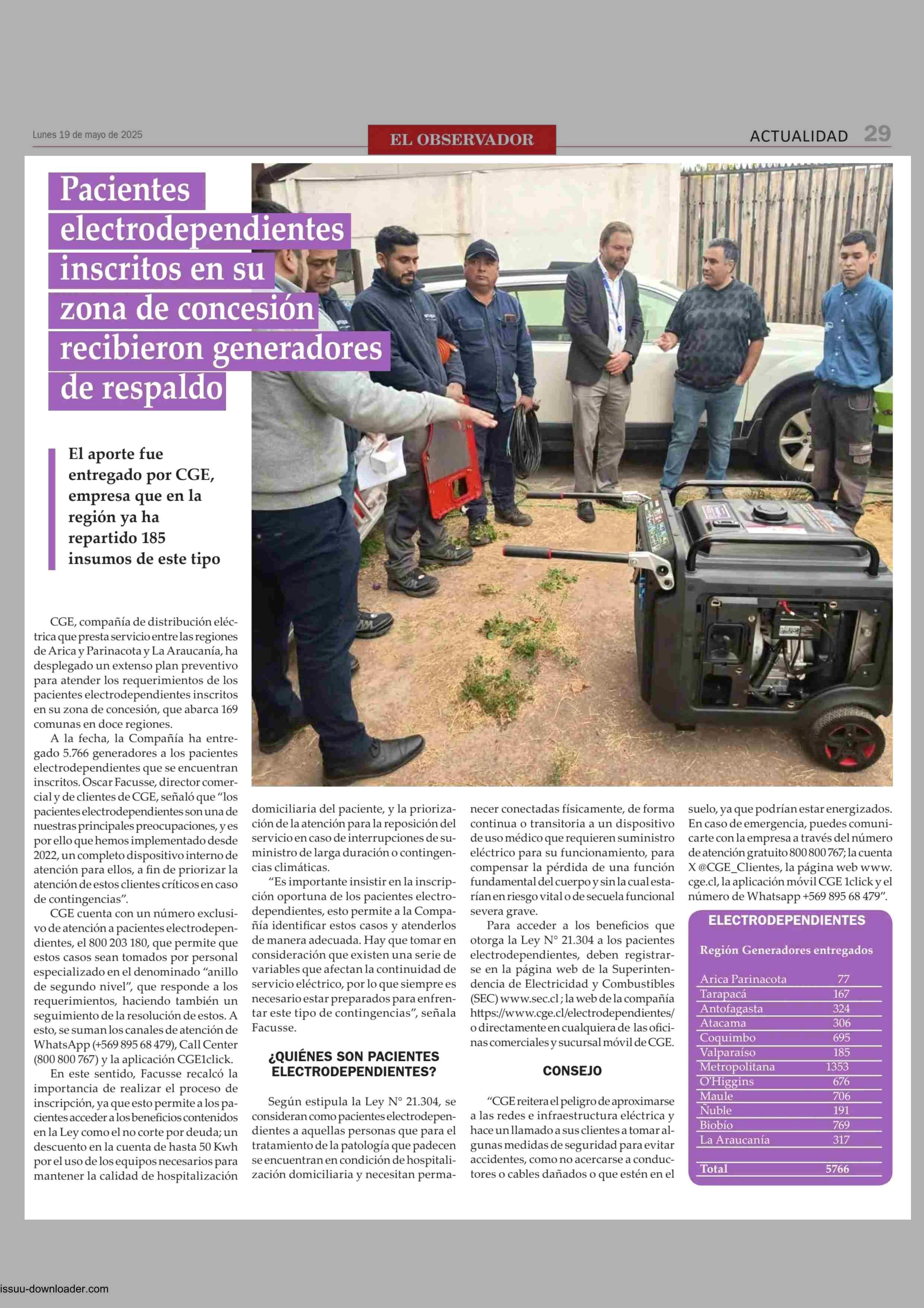 Pacientes electrodependientes inscritos en su zona de concesión recibieron generadores de respaldo 19-05-2025 El Observador Vespertino |