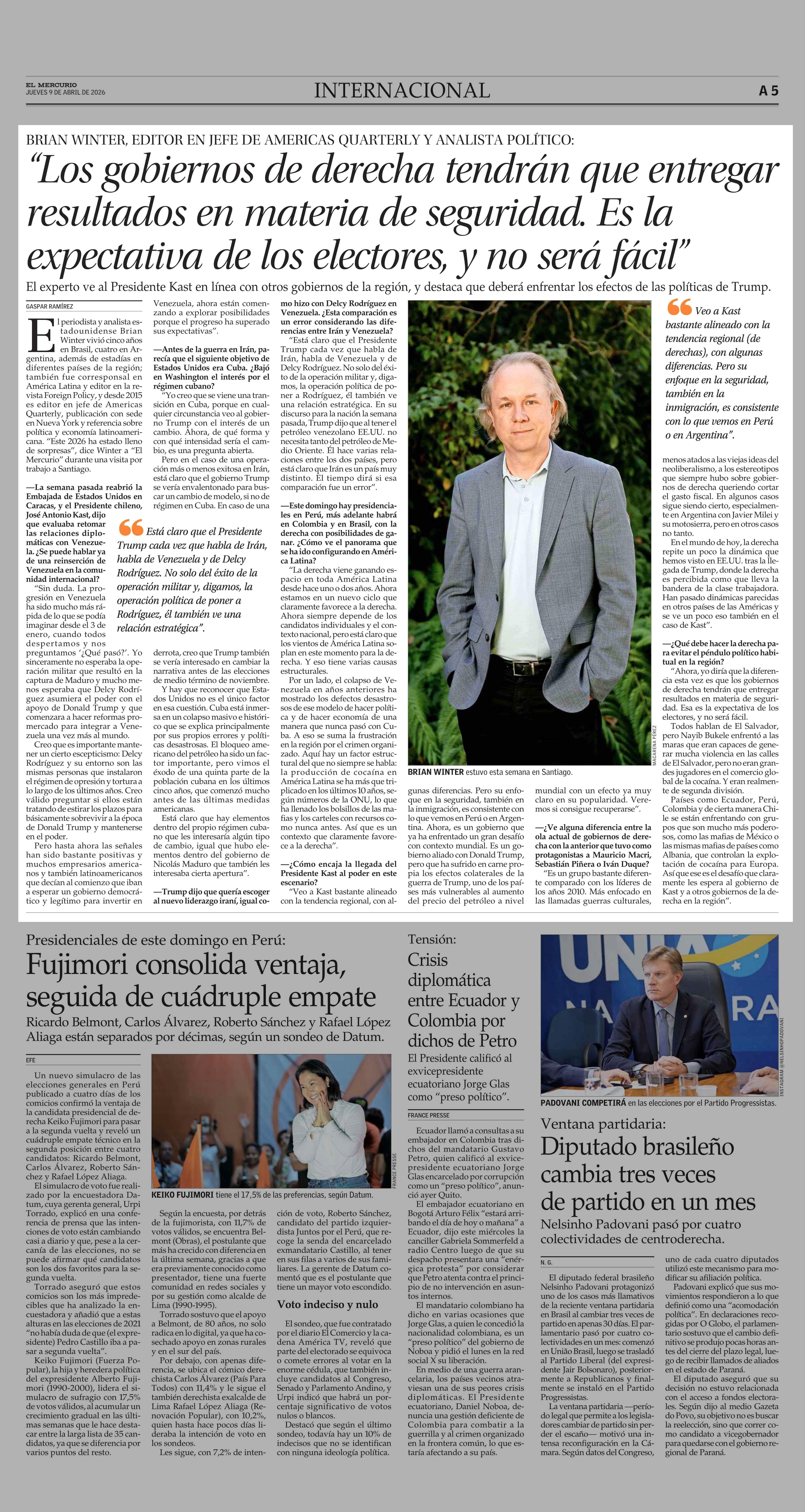 “Los gobiernos de derecha tendrán que entregar resultados en materia de seguridad. Es la expectativa de los electores, y no será fácil” 09-04-2026 El Mercurio |
