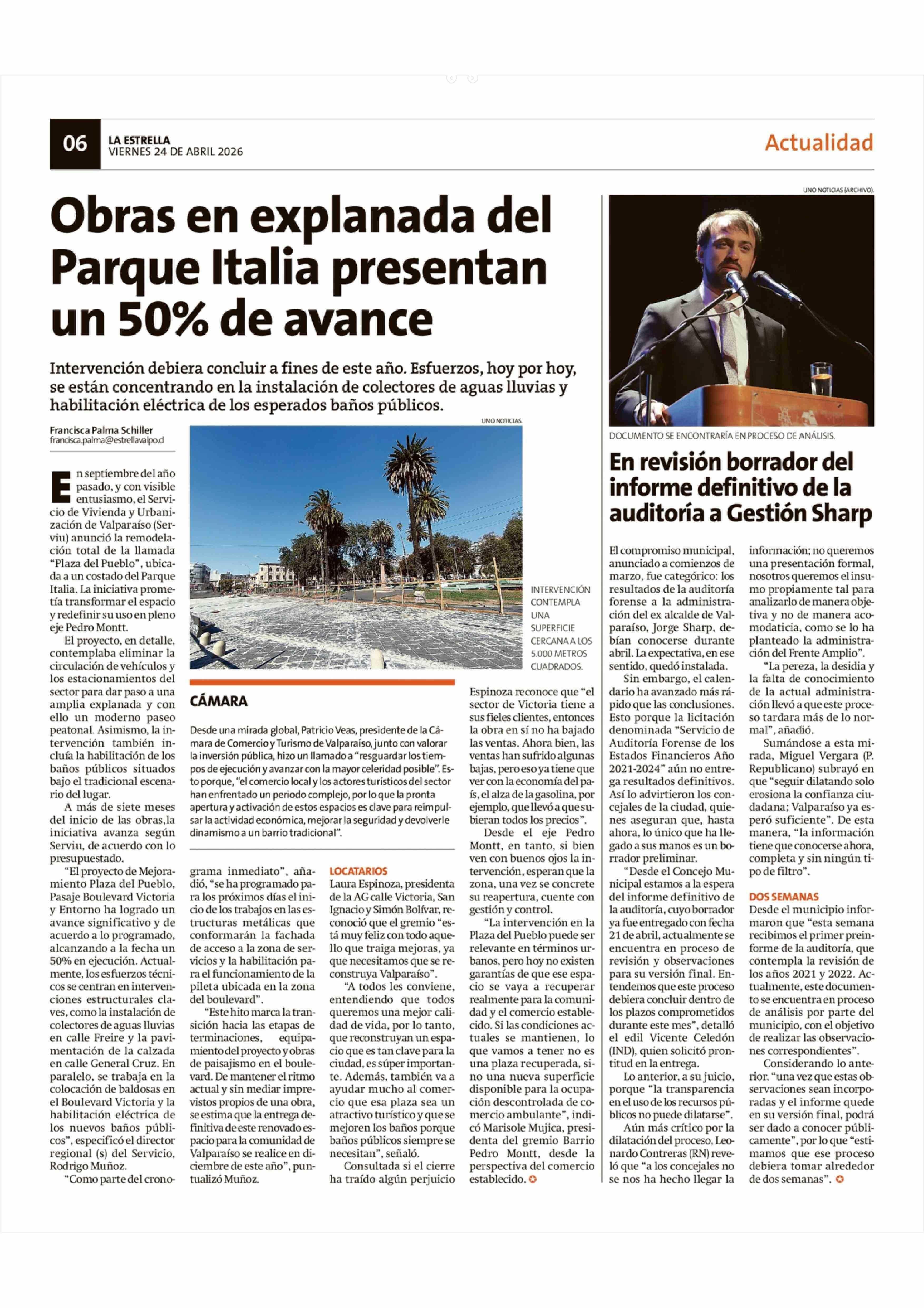 Obras en explanada del Parque Italia presentan un 50% de avance 24-04-2026 La Estrella de Valparaíso |