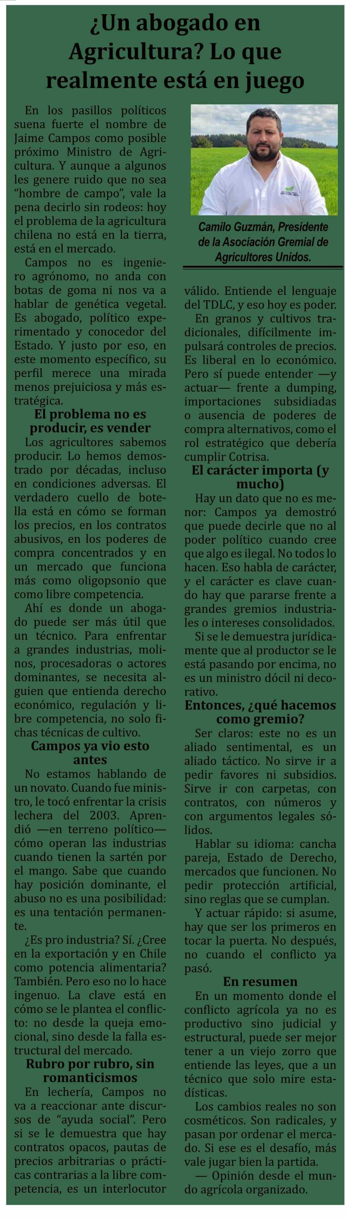 | Título: | Columnas de Opinión: ¿Un abogado en Agricultura? Lo que realmente está en juego |