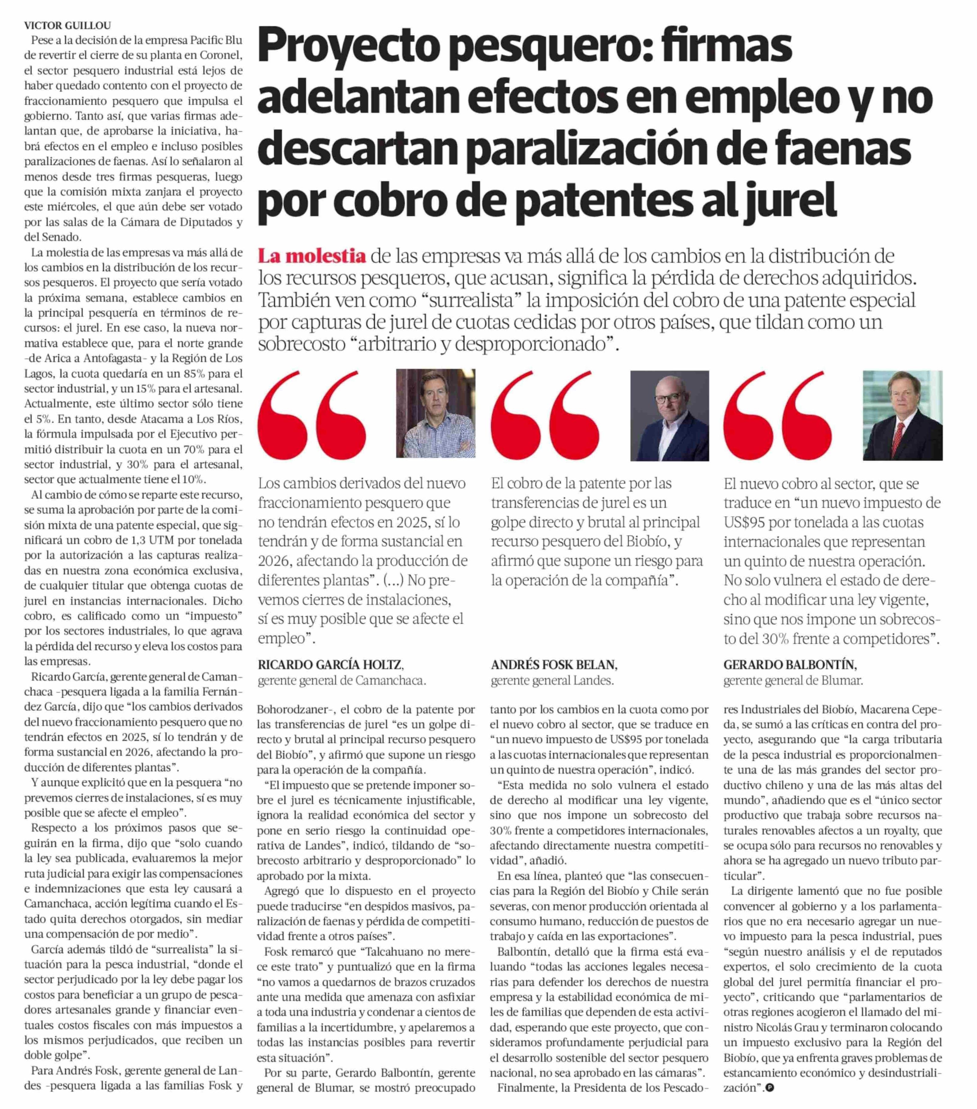 Proyecto pesquero: firmas adelantan efectos en empleo y no descartan paralización de faenas por cobro de patentes al jurel 06-06-2025 La Tercera |