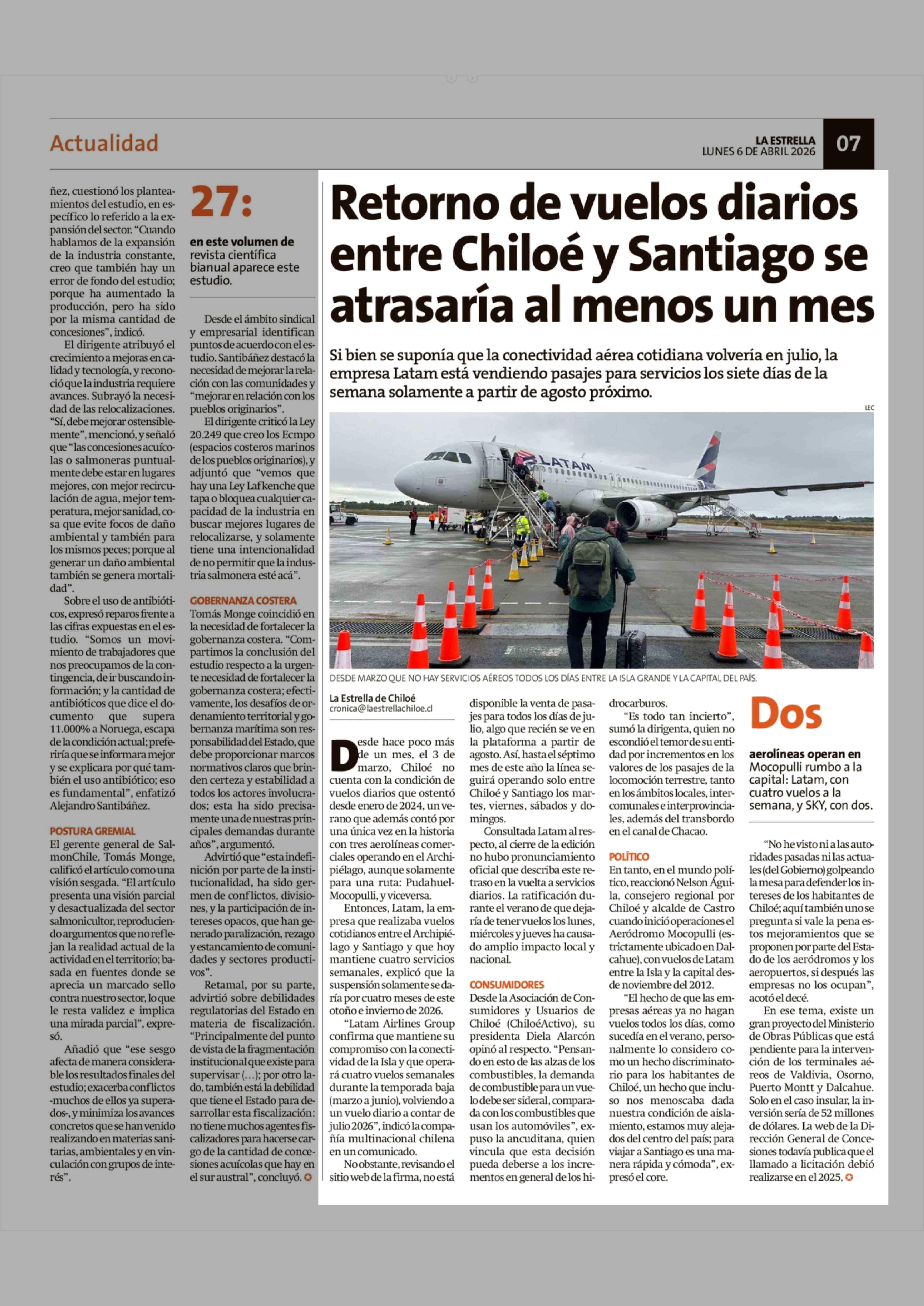 Retorno de vuelos diarios entre Chiloé y Santiago se atrasaría al menos un mes 06-04-2026 La Estrella de Chiloé |