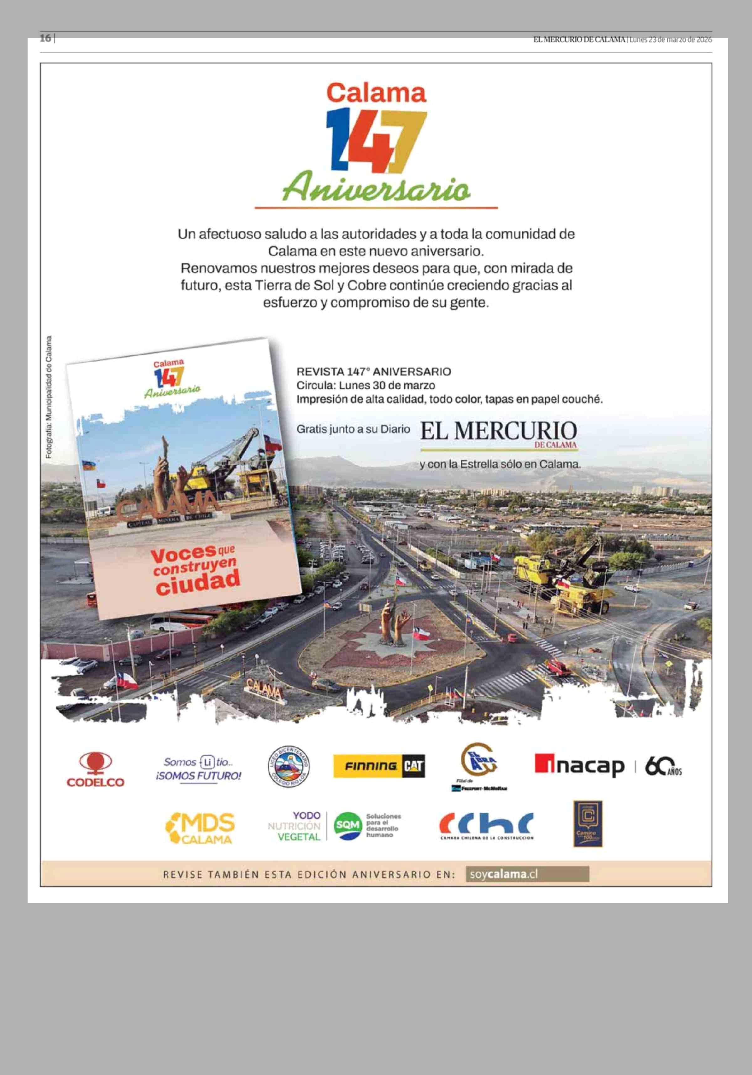 Aviso Publicitario: CALAMA 147 ANIVERSARIO 23-03-2026 El Mercurio de Calama |