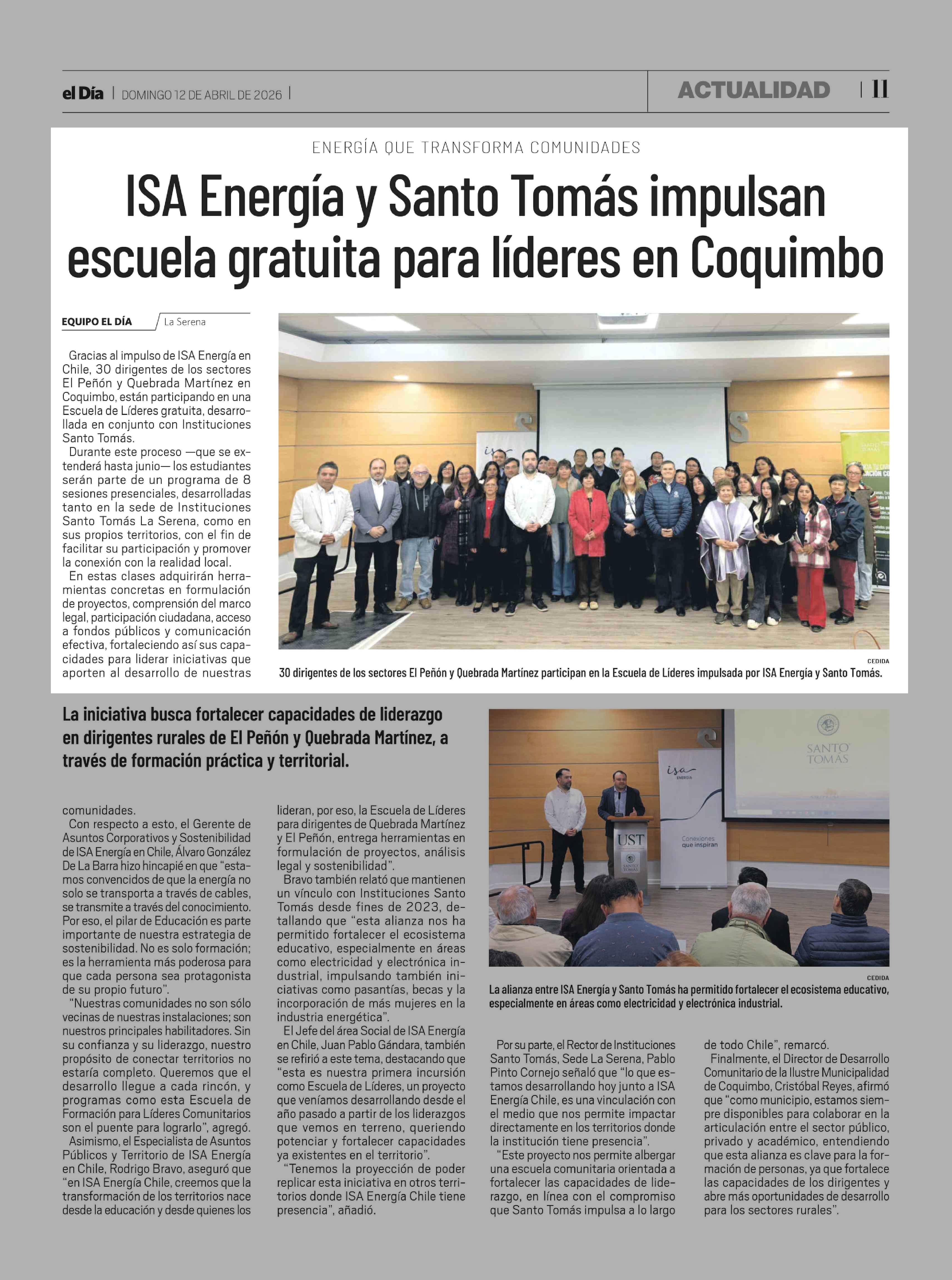 ISA Energía y Santo Tomás impulsan escuela gratuita para líderes en Coquimbo 12-04-2026 El Día |