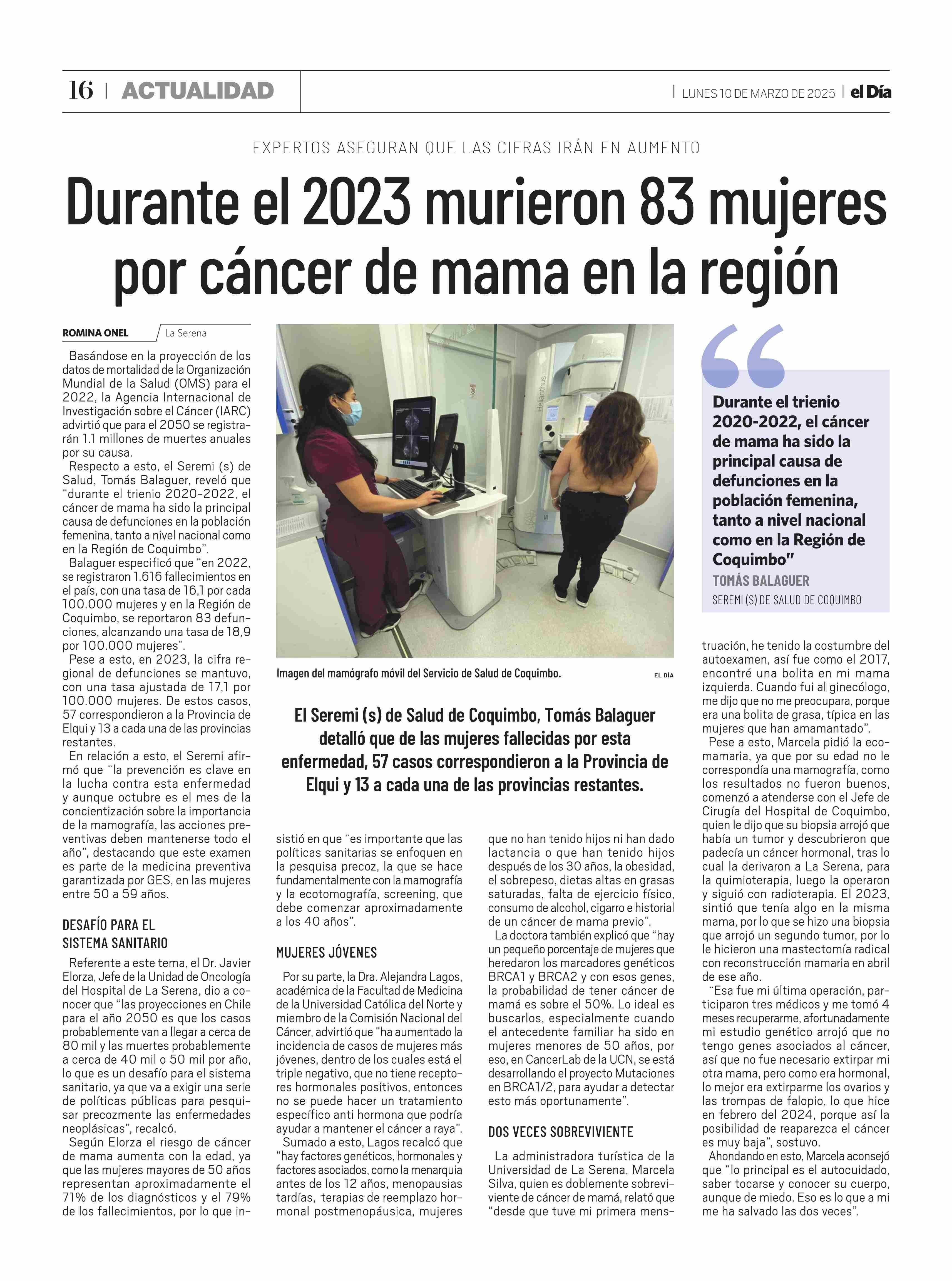 Durante el 2023 murieron 83 mujeres por cáncer de mama en la región 10-03-2025 El Día |
