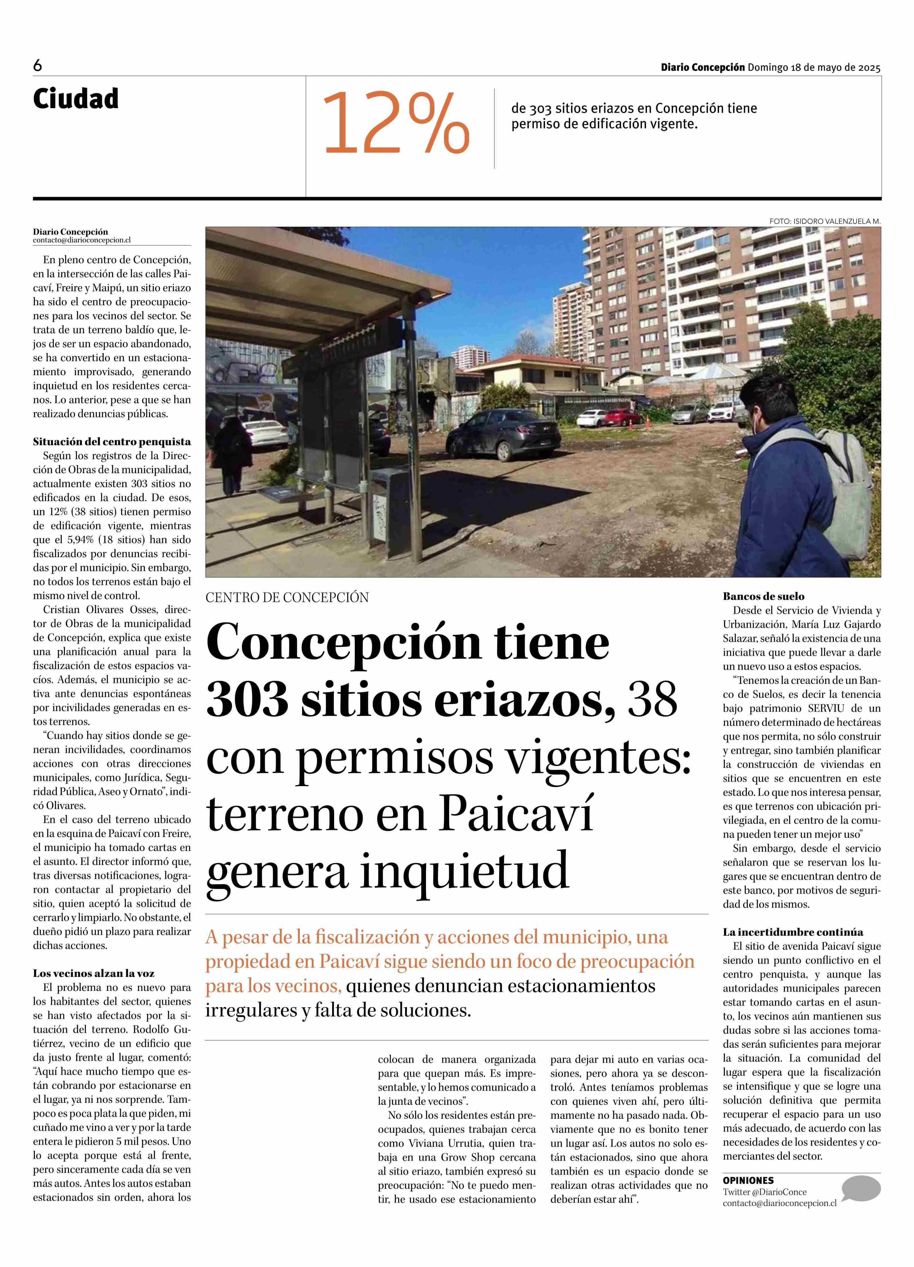 Concepción tiene 303 sitios eriazos, 38 con permisos vigentes: terreno en Paicaví genera inquietud 18-05-2025 Diario Concepción |