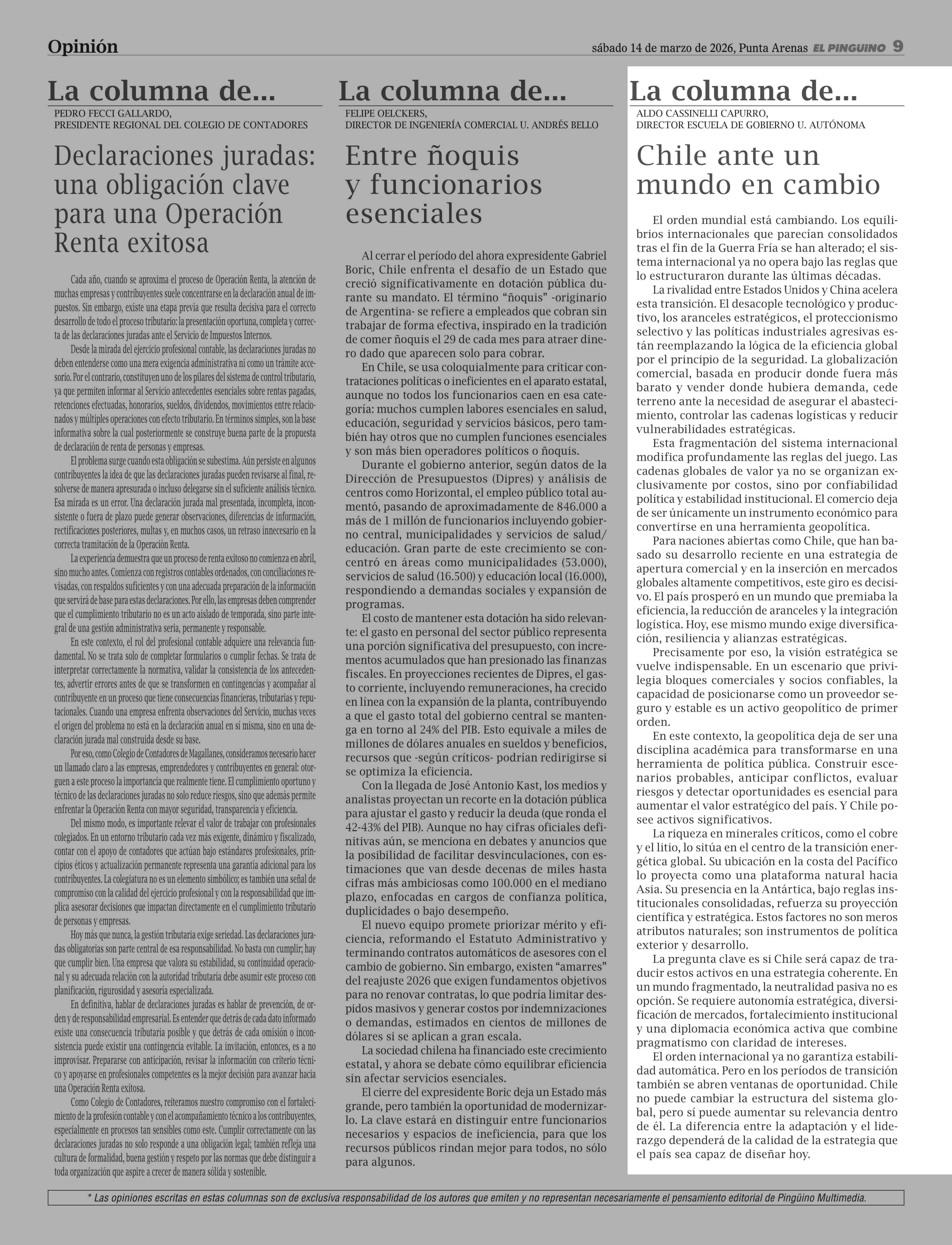COLUMNAS DE OPINIÓN: La columna de... Chile ante un mundo en cambio 14-03-2026 El Pingüino |