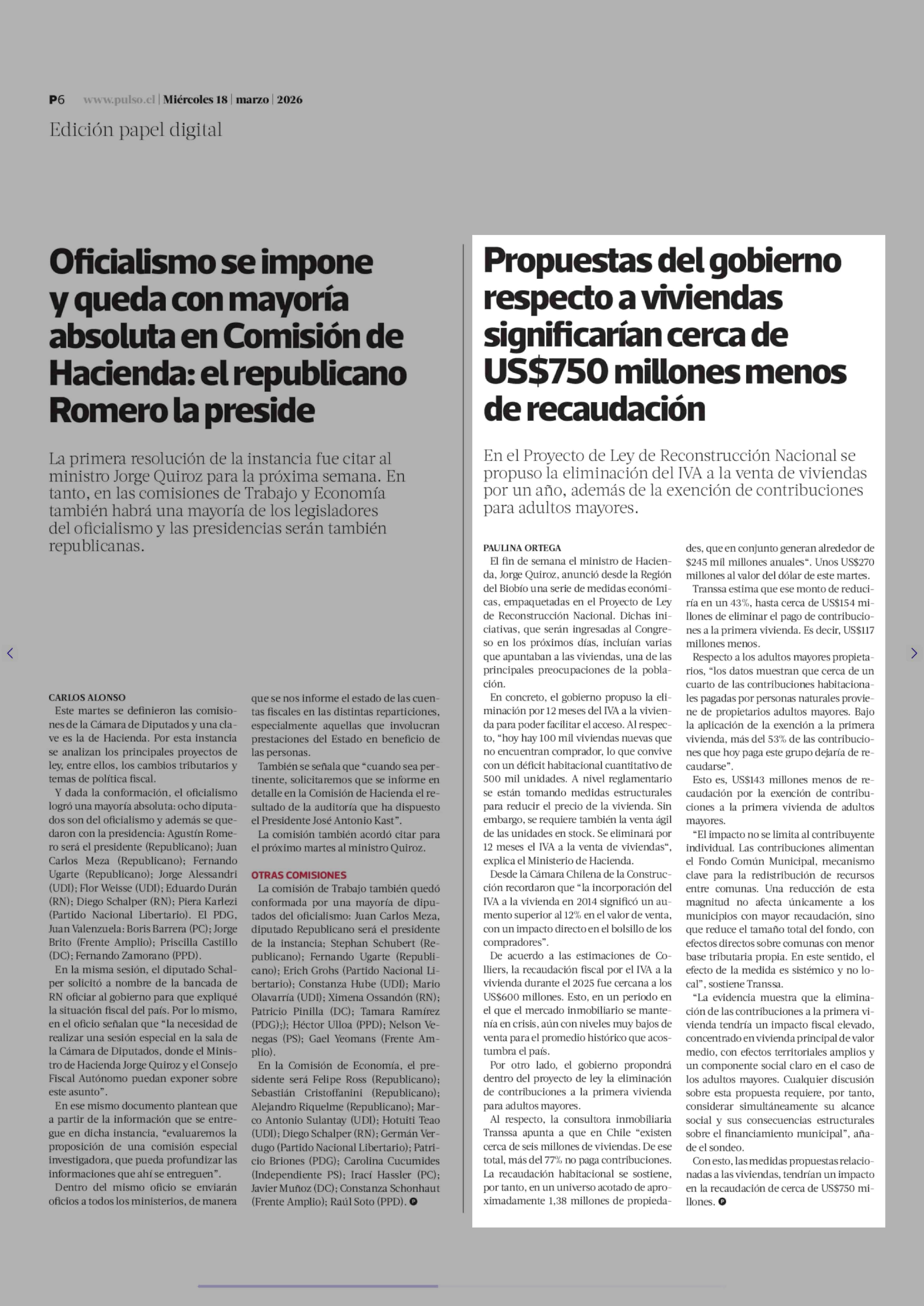 Propuestas del gobierno respecto a viviendas significarían cerca de US$750 millones menos de recaudación 18-03-2026 La Tercera |