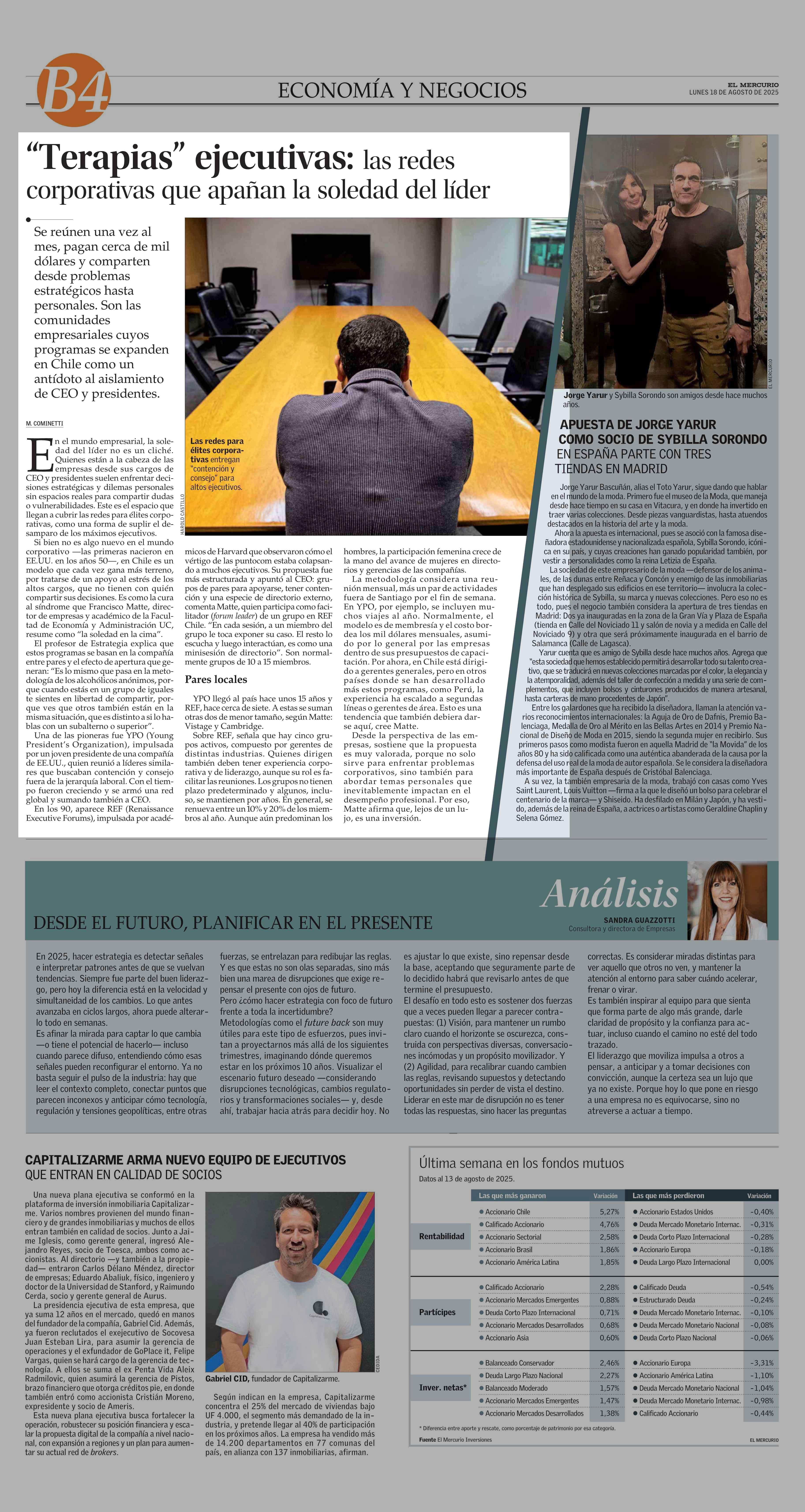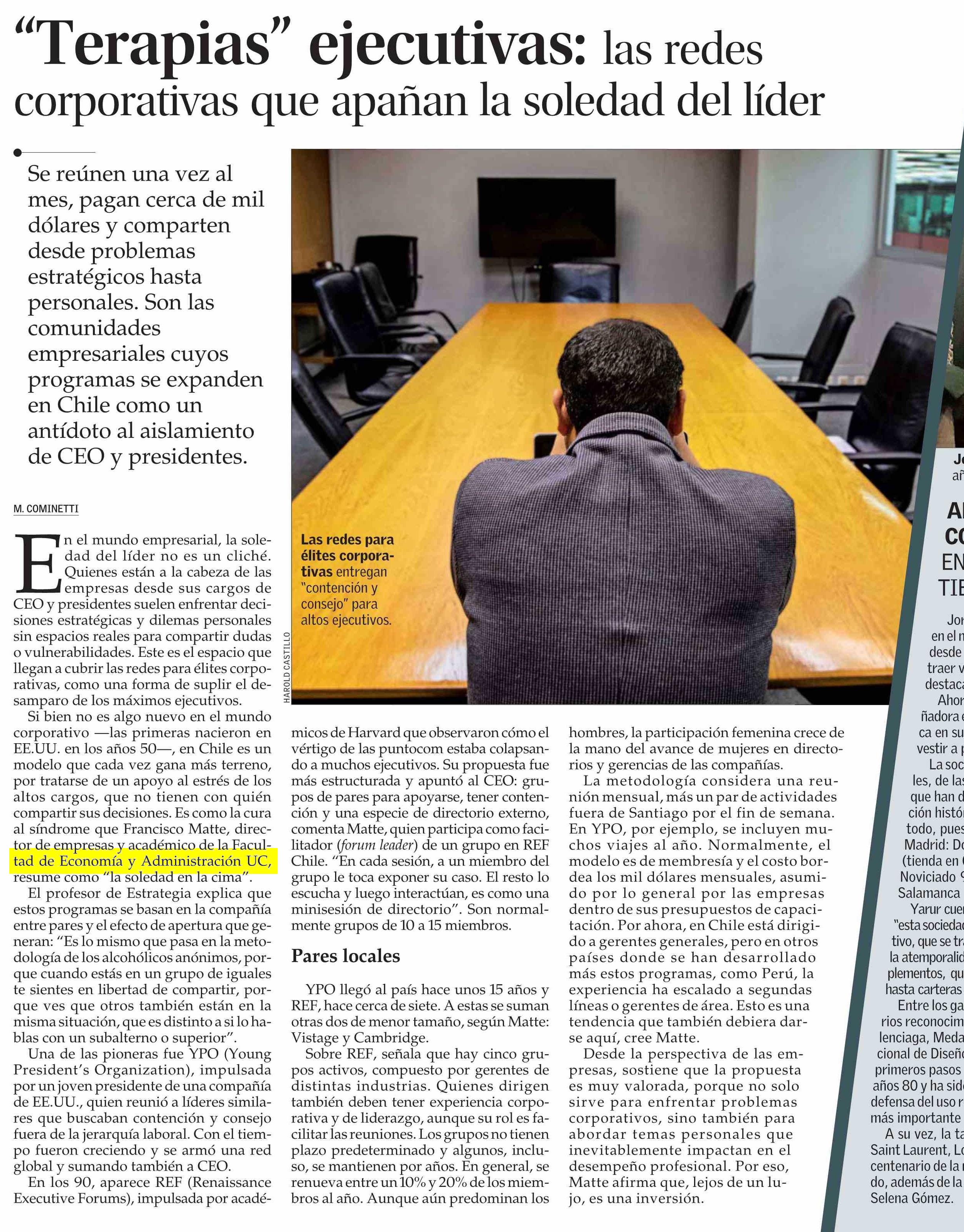 “Terapias” ejecutivas: las redes corporativas que apañan la soledad del líder 18-08-2025 El Mercurio |