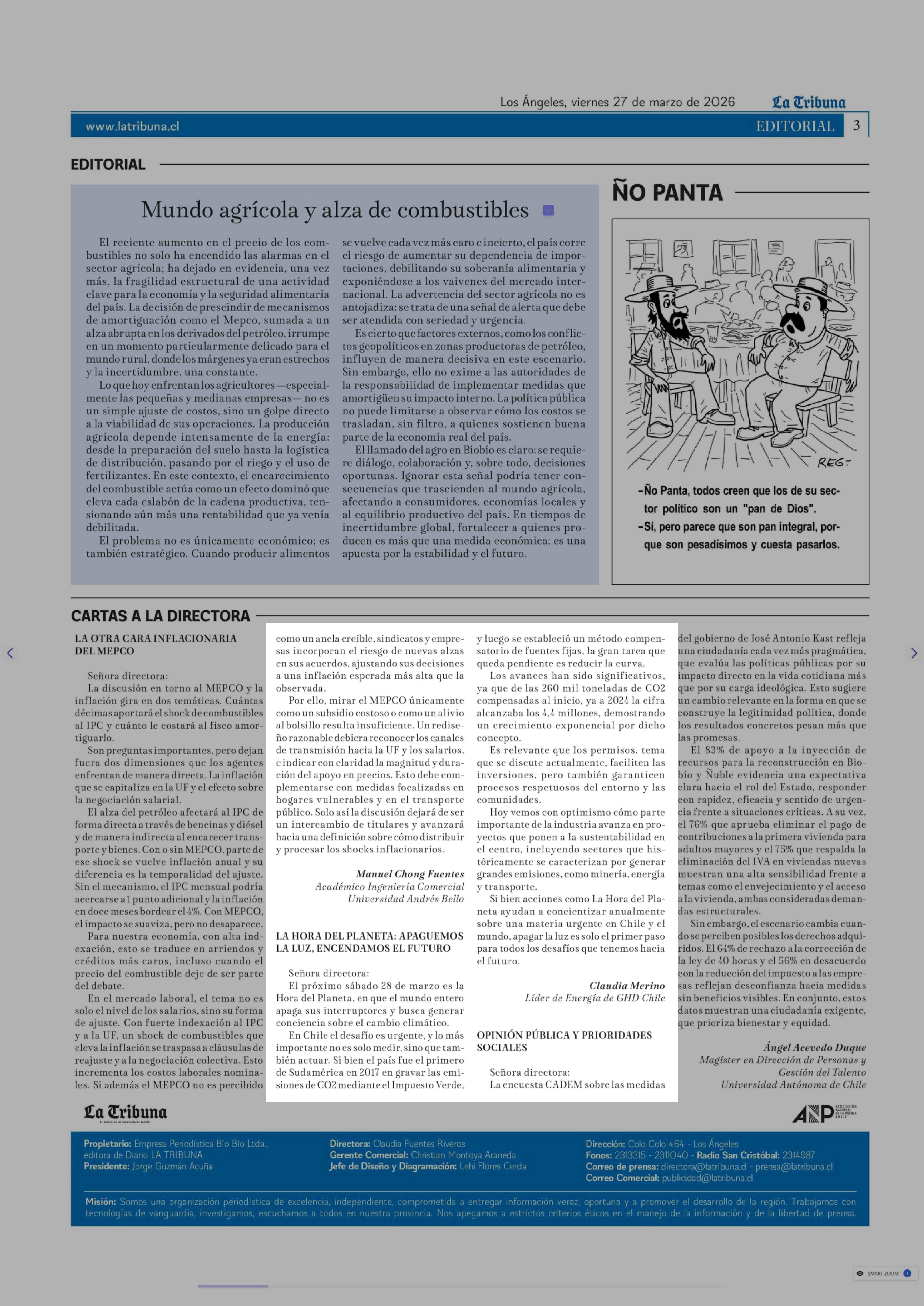 Cartas: LA HORA DEL PLANETA: APAGUEMOS LA LUZ, ENCENDAMOS EL FUTURO 27-03-2026 La Tribuna |