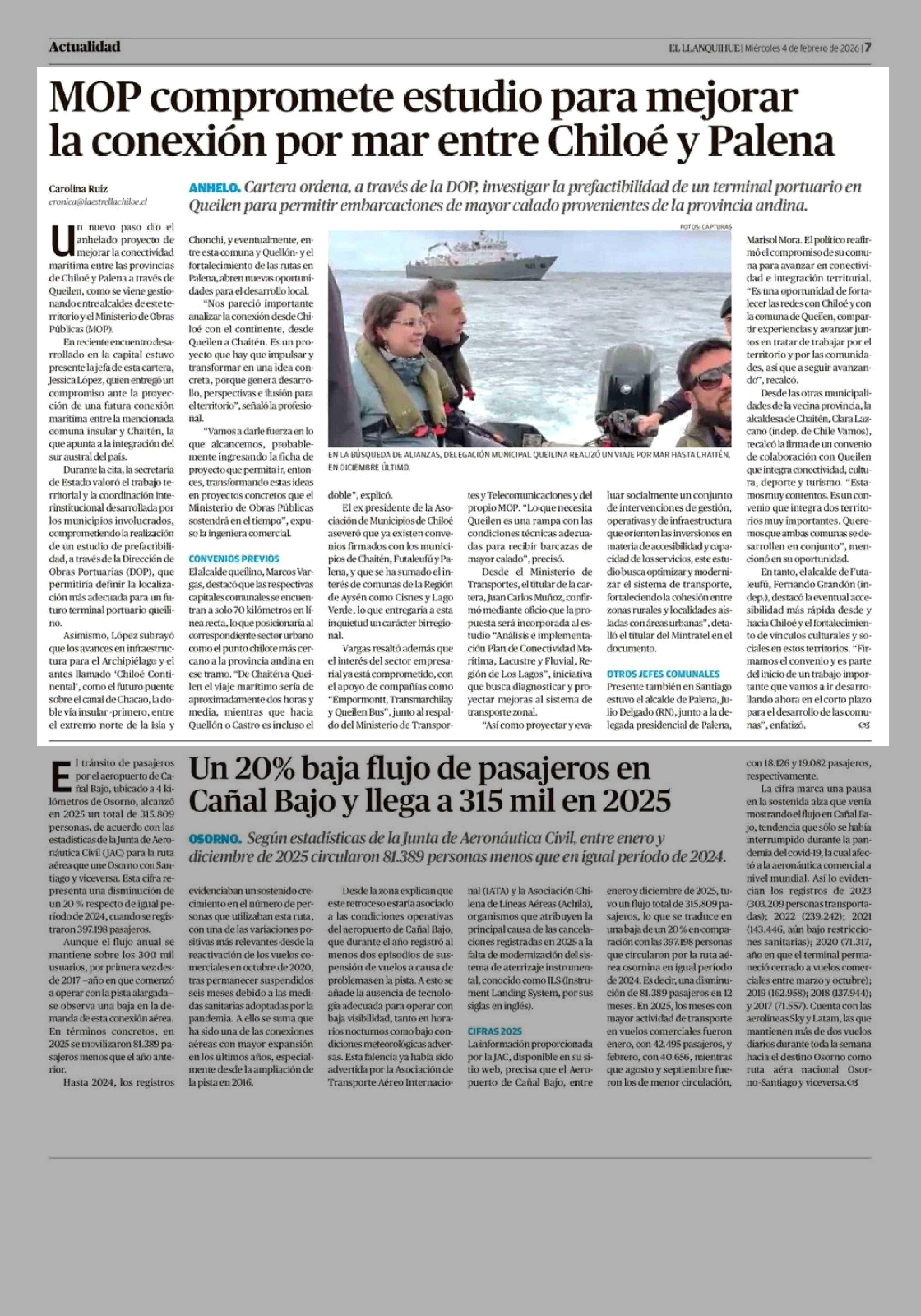 MOP compromete estudio para mejorar la conexión por mar entre Chiloé y Palena 04-02-2026 El Llanquihue |