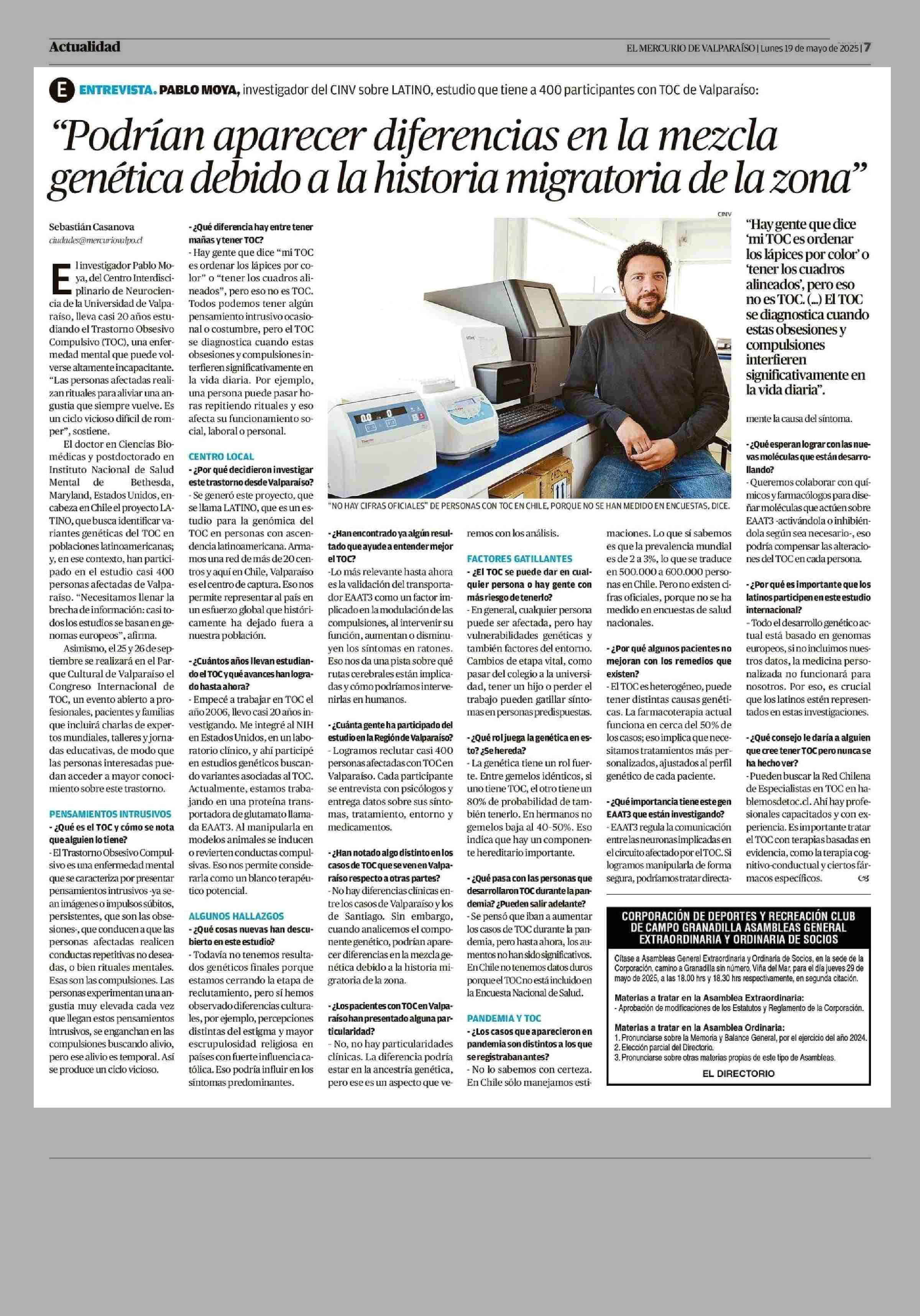 “Podrían aparecer diferencias en la mezcla genética debido a la historia migratoria de la zona” 19-05-2025 El Mercurio de Valparaíso |