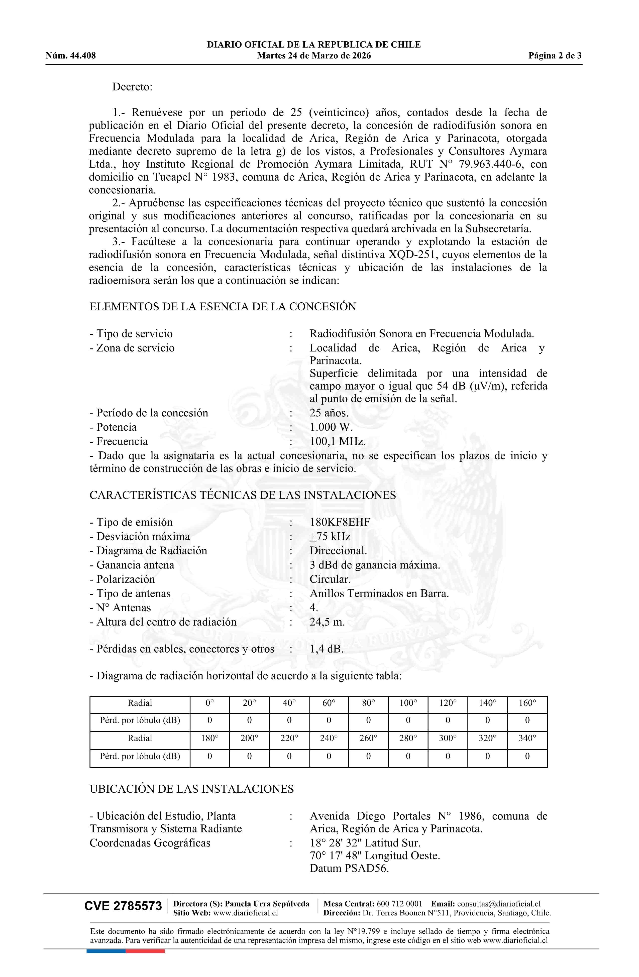 | Título: | Decreto exento número 248, de 2026.- Renueva concesión de radiodifusión sonora en frecuencia modulada para la localidad de Arica |