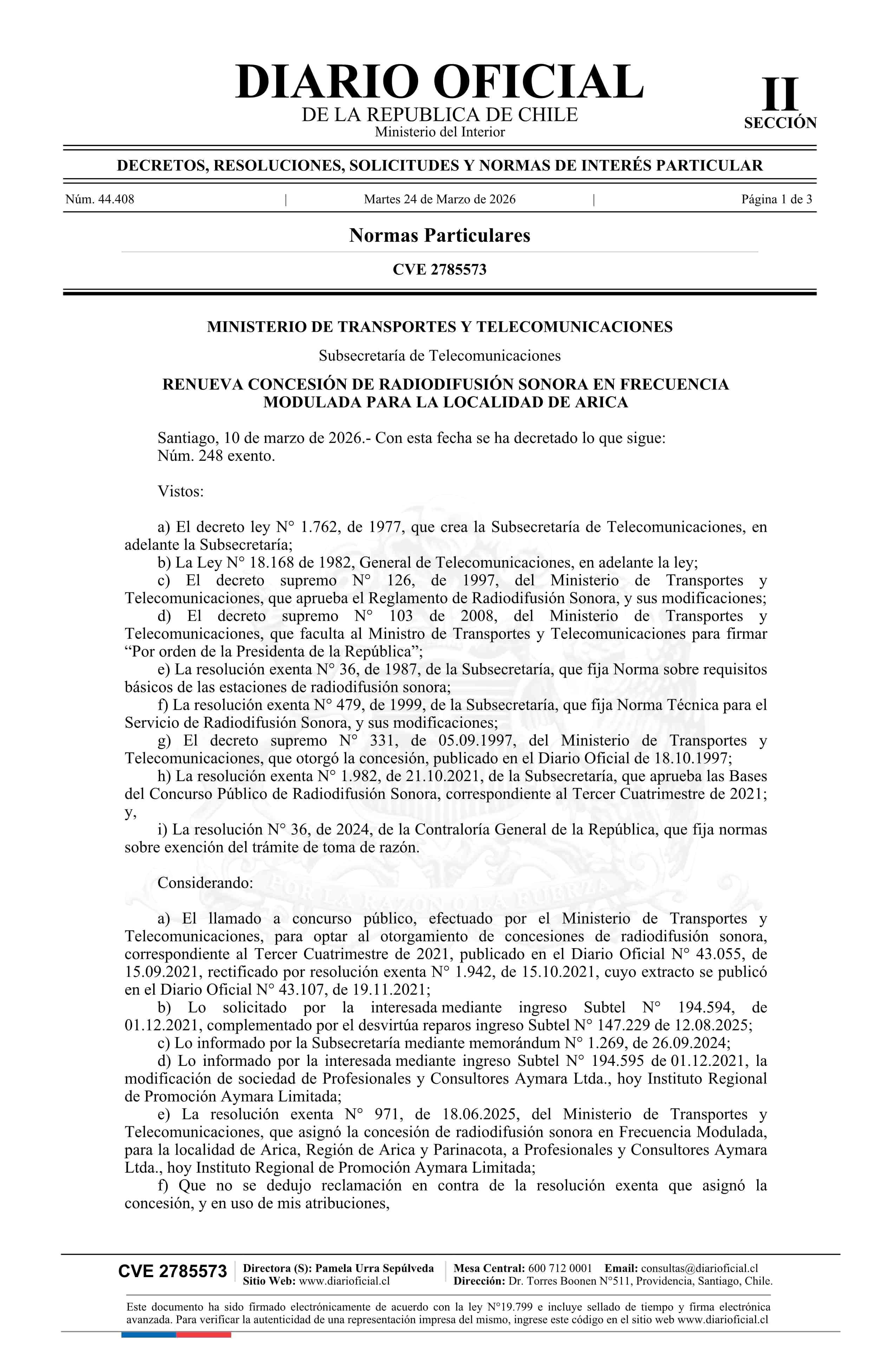 Decreto exento número 248, de 2026.- Renueva concesión de radiodifusión sonora en frecuencia modulada para la localidad de Arica 24-03-2026 Diario Oficial Edición Electrónica |