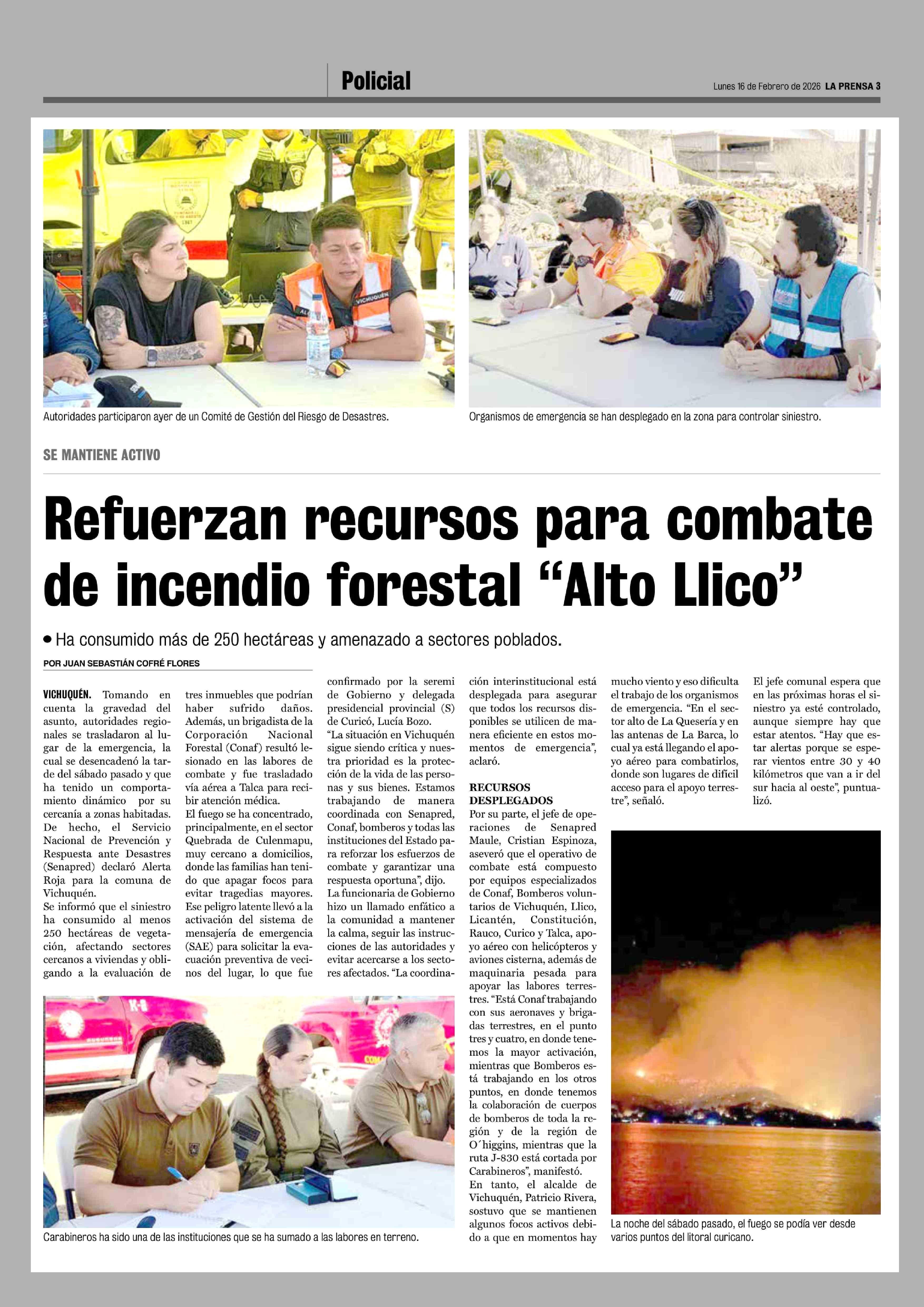 Refuerzan recursos para combate de incendio forestal "Alto Llico" 16-02-2026 La Prensa de Curicó |