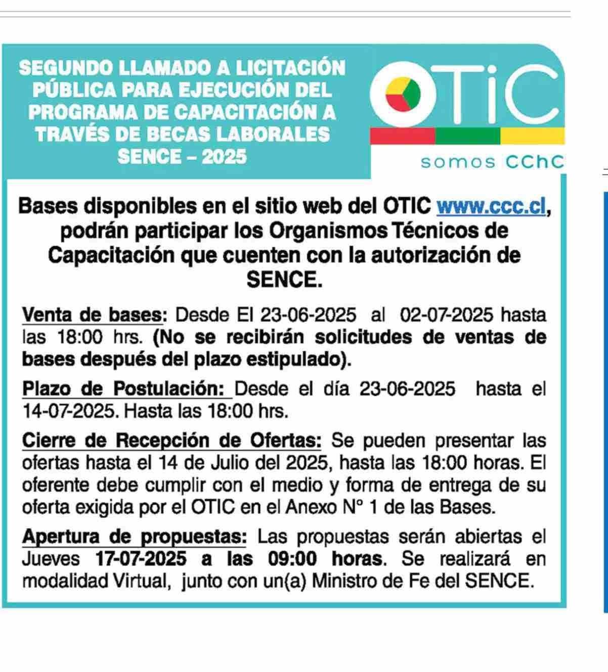 AVISO LICITACIONES: Bases disponibles en el sitio web del OTIC www.ccc.cl, SENCE. 23-06-2025 Las Últimas Noticias |