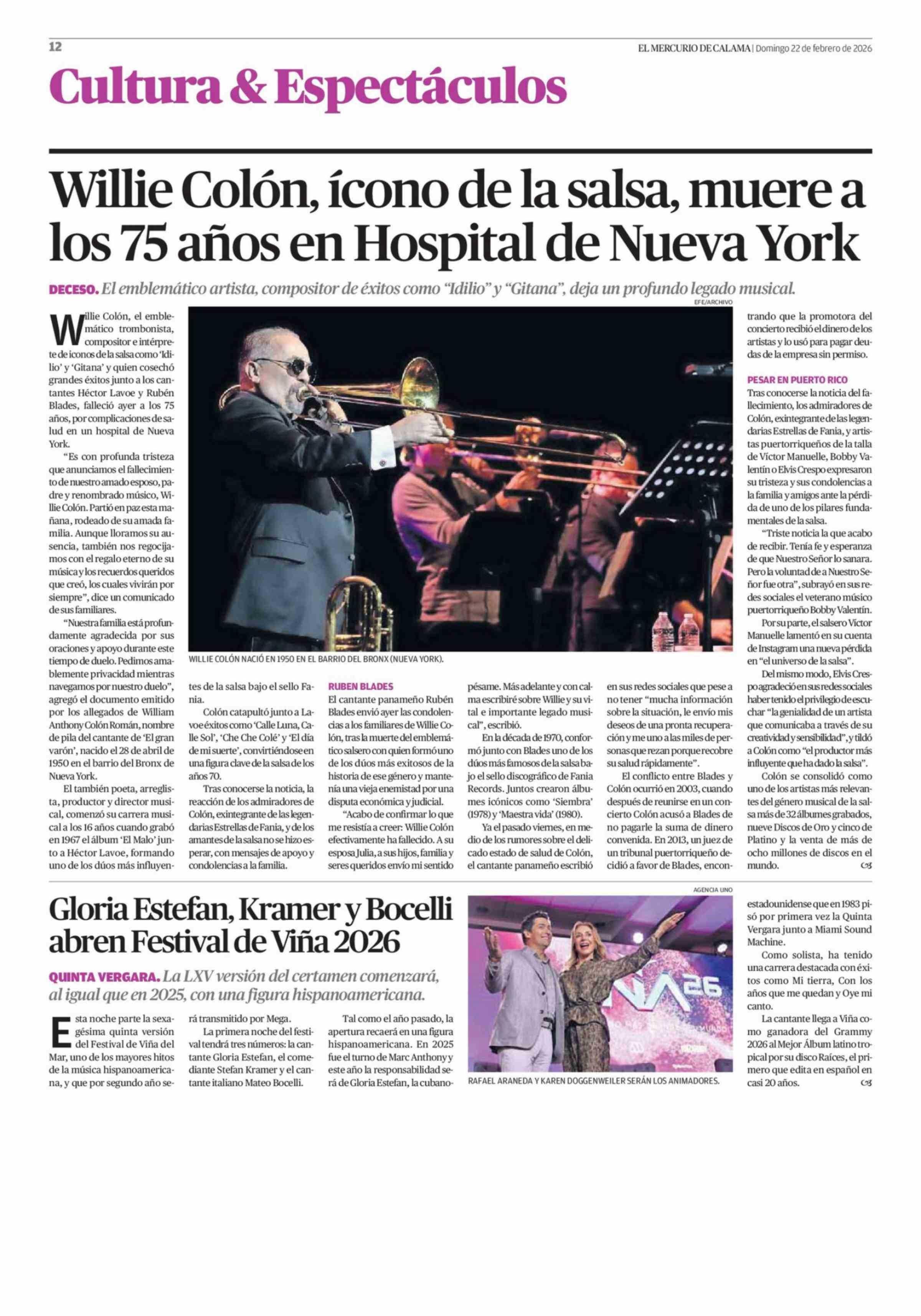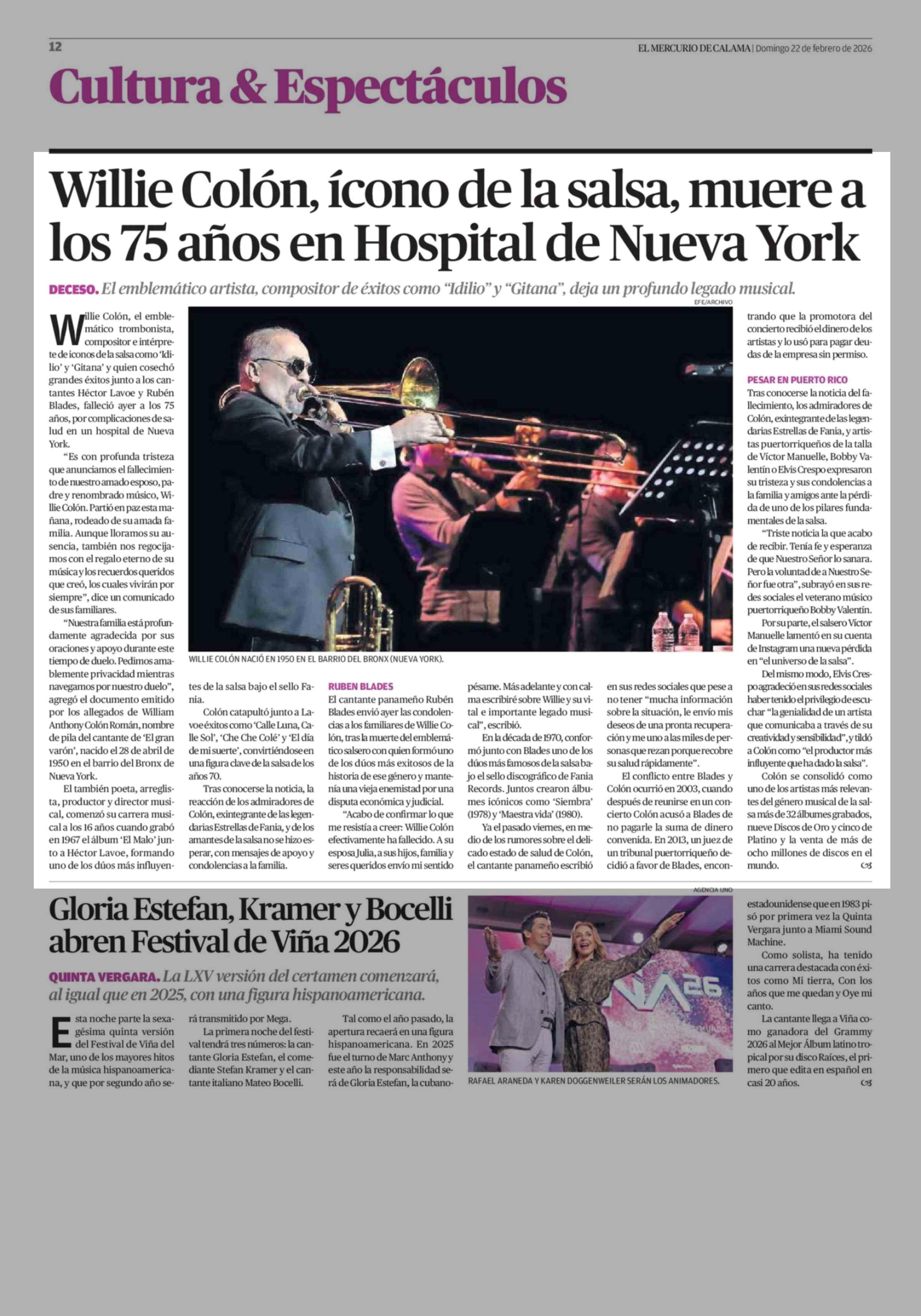 Willie Colón, ícono de la salsa, muere a los 75 años en Hospital de Nueva York 22-02-2026 El Mercurio de Calama |