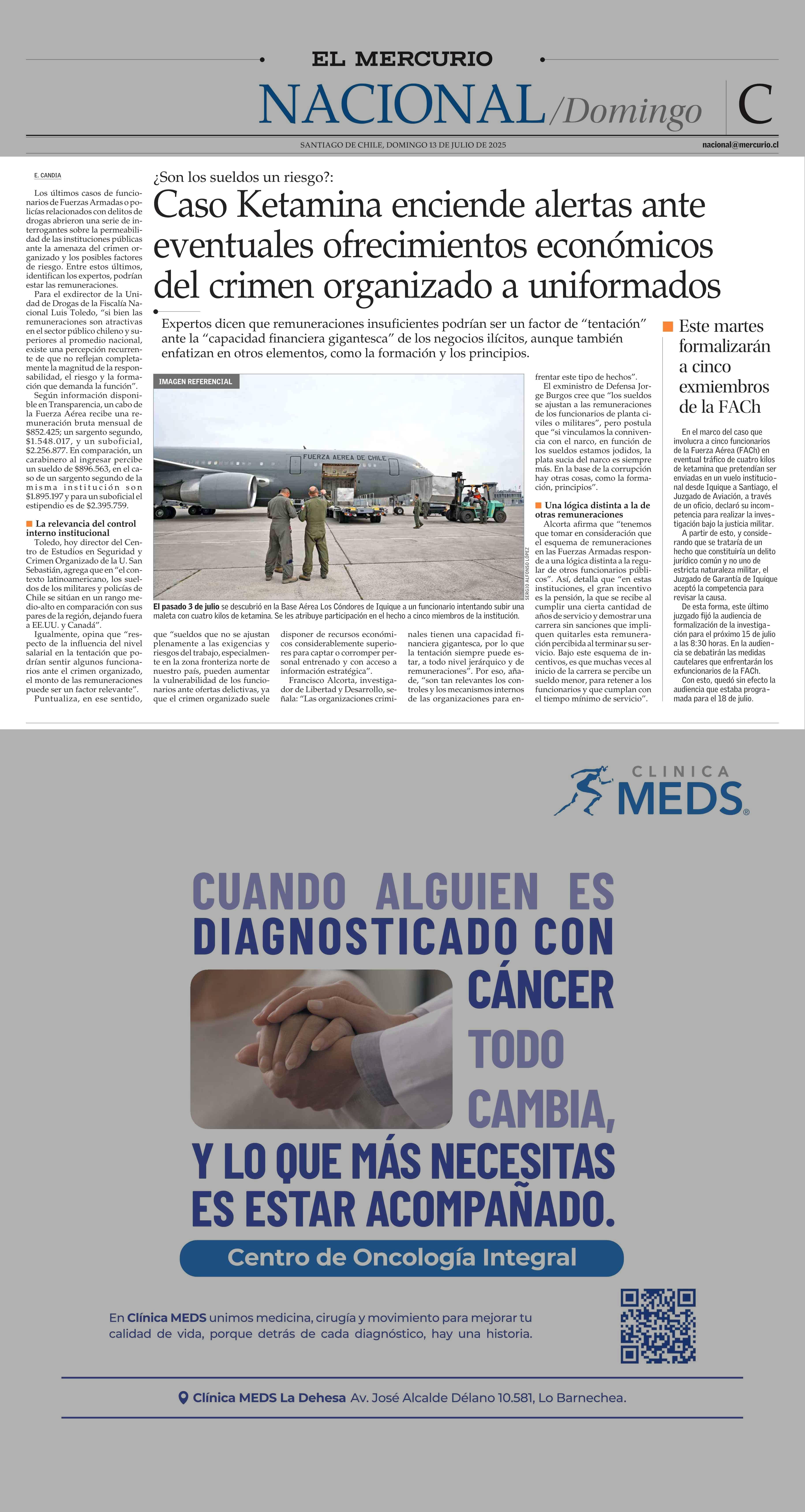 Caso Ketamina enciende alertas ante eventuales ofrecimientos económicos del crimen organizado a uniformados 13-07-2025 El Mercurio |