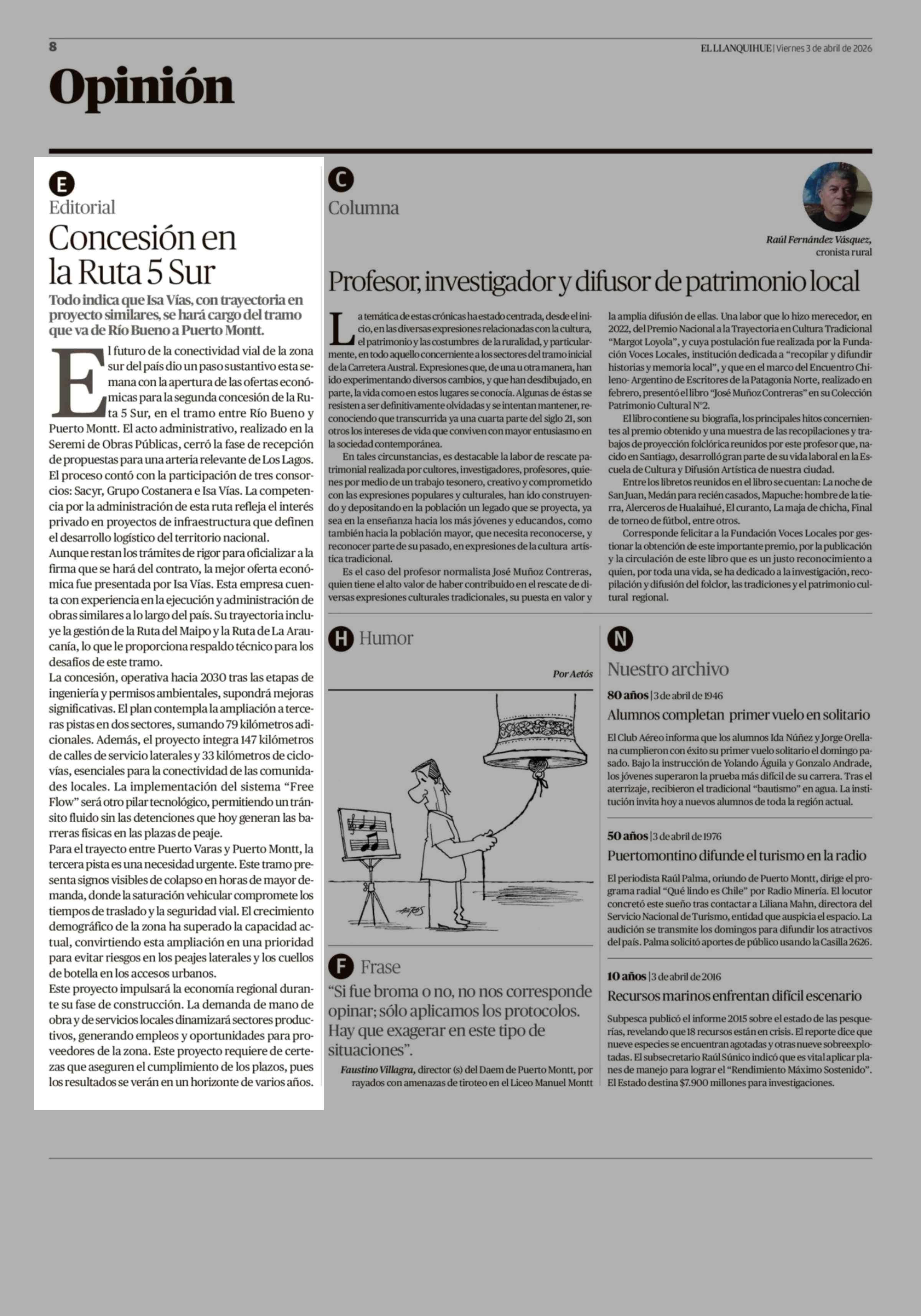 Editorial: Concesión en la Ruta 5 Sur 03-04-2026 El Llanquihue |