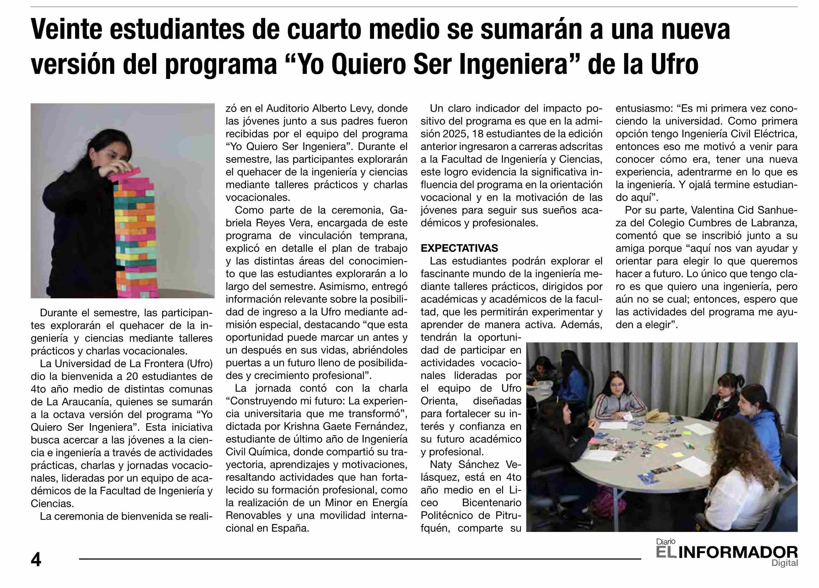 Veinte estudiantes de cuarto medio se sumarán a una nueva versión del programa “Yo Quiero Ser Ingeniera” de la Ufro 29-05-2025 El Informador |
