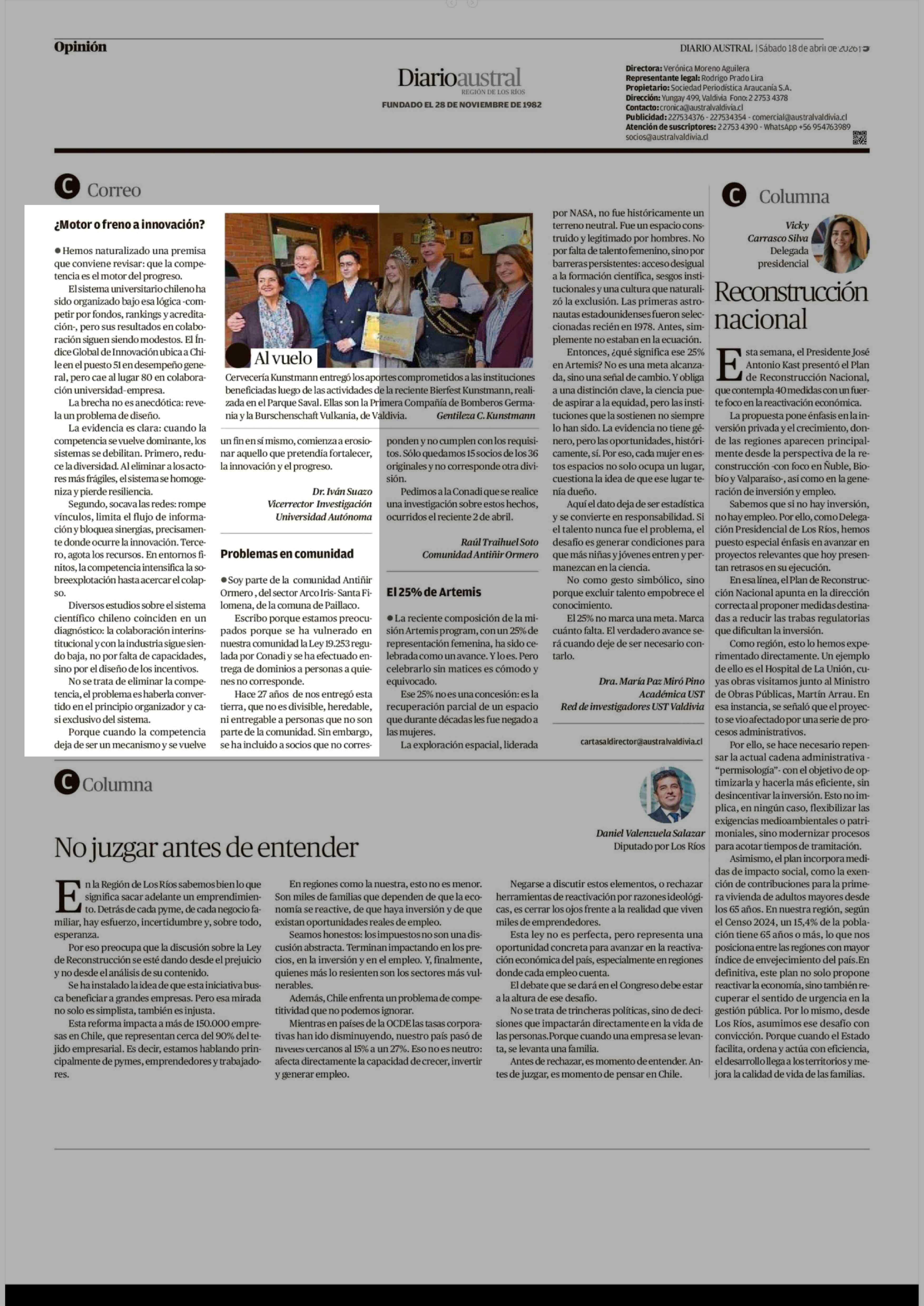 CARTAS: ¿Motor o freno a innovación? 18-04-2026 Diario Austral Región de Los Ríos |