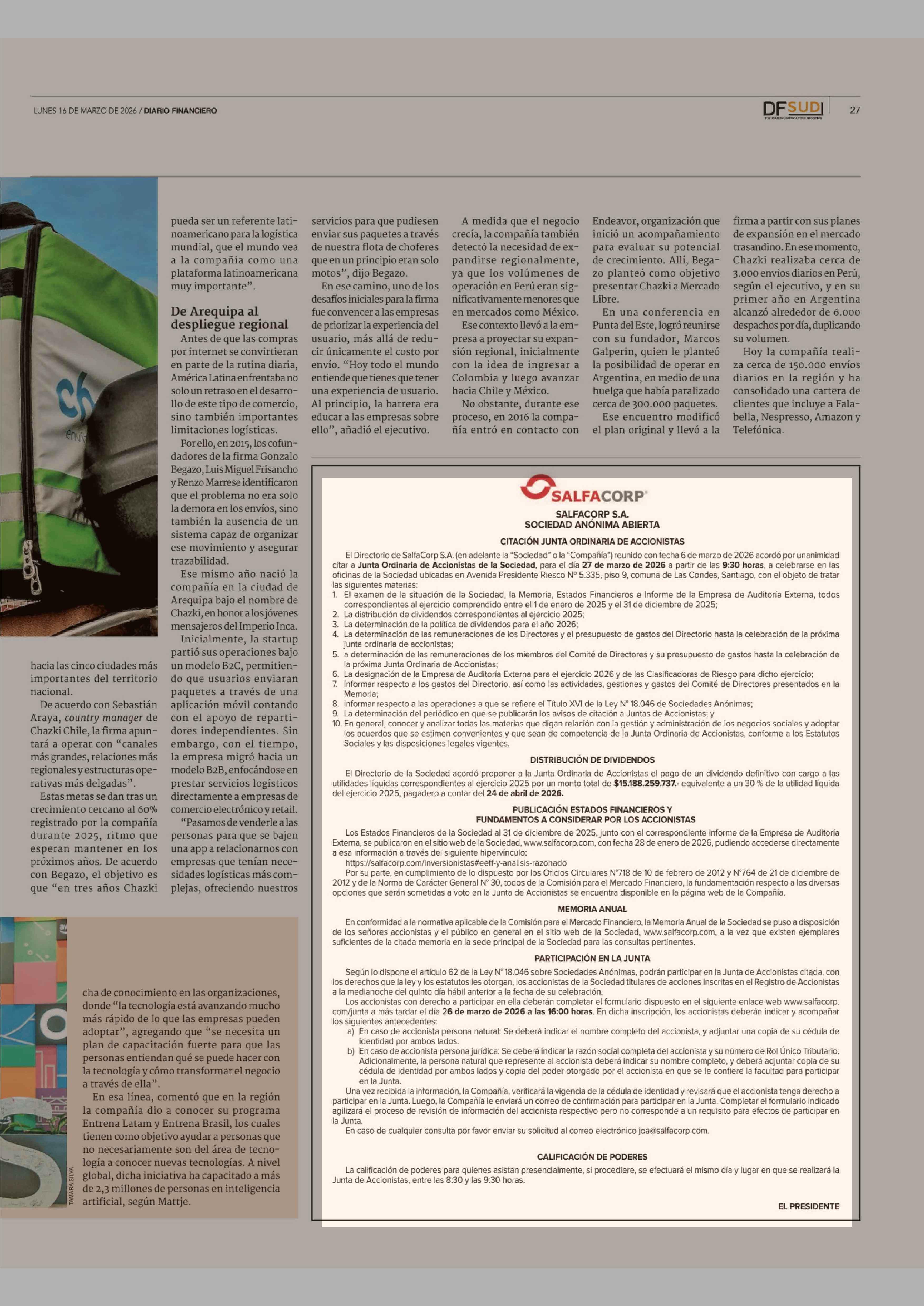EXTRACTO: CITACIÓN JUNTA ORDINARIA DE ACCIONISTAS SalfaCorp S.A 16-03-2026 Diario Financiero |