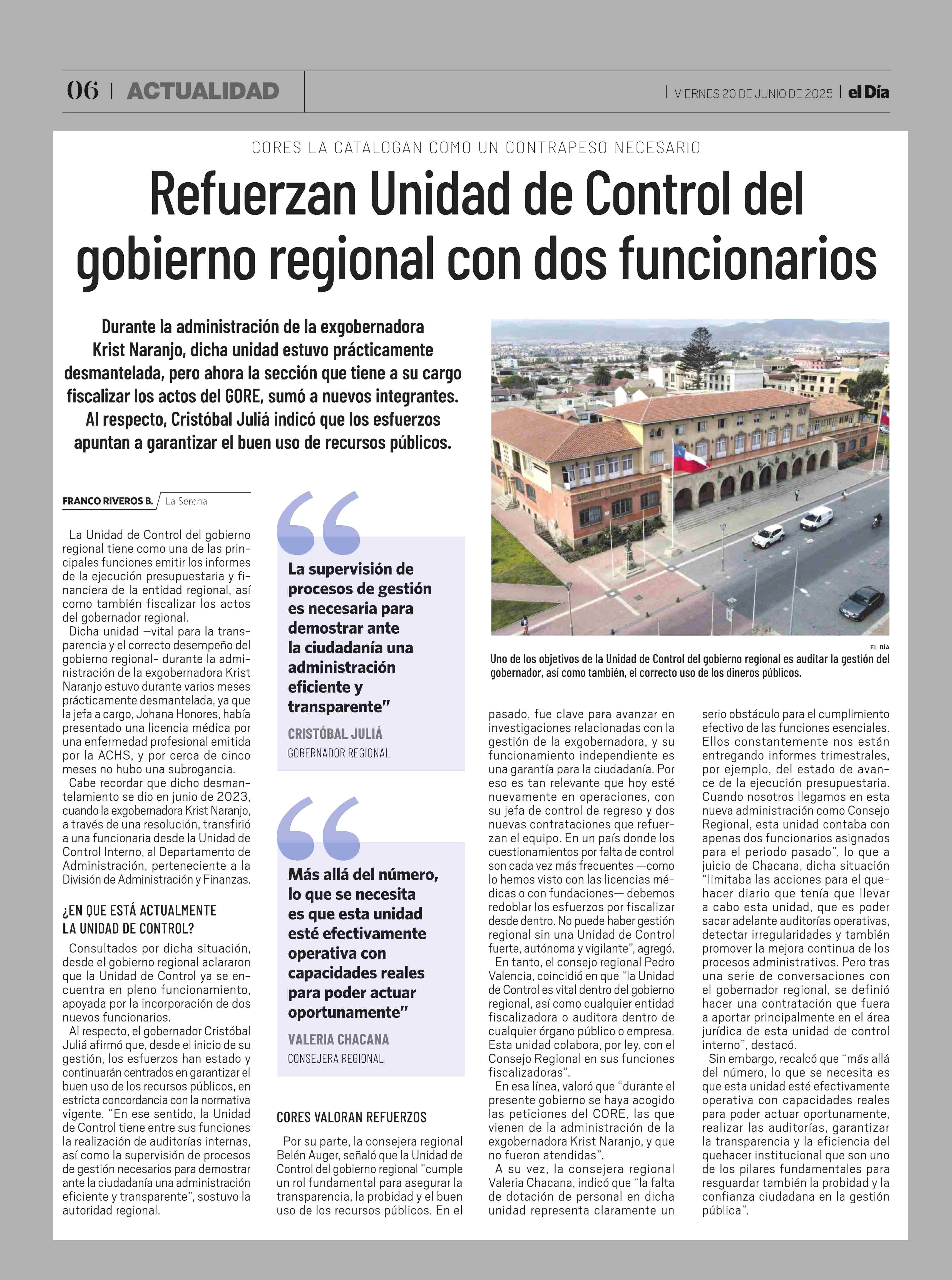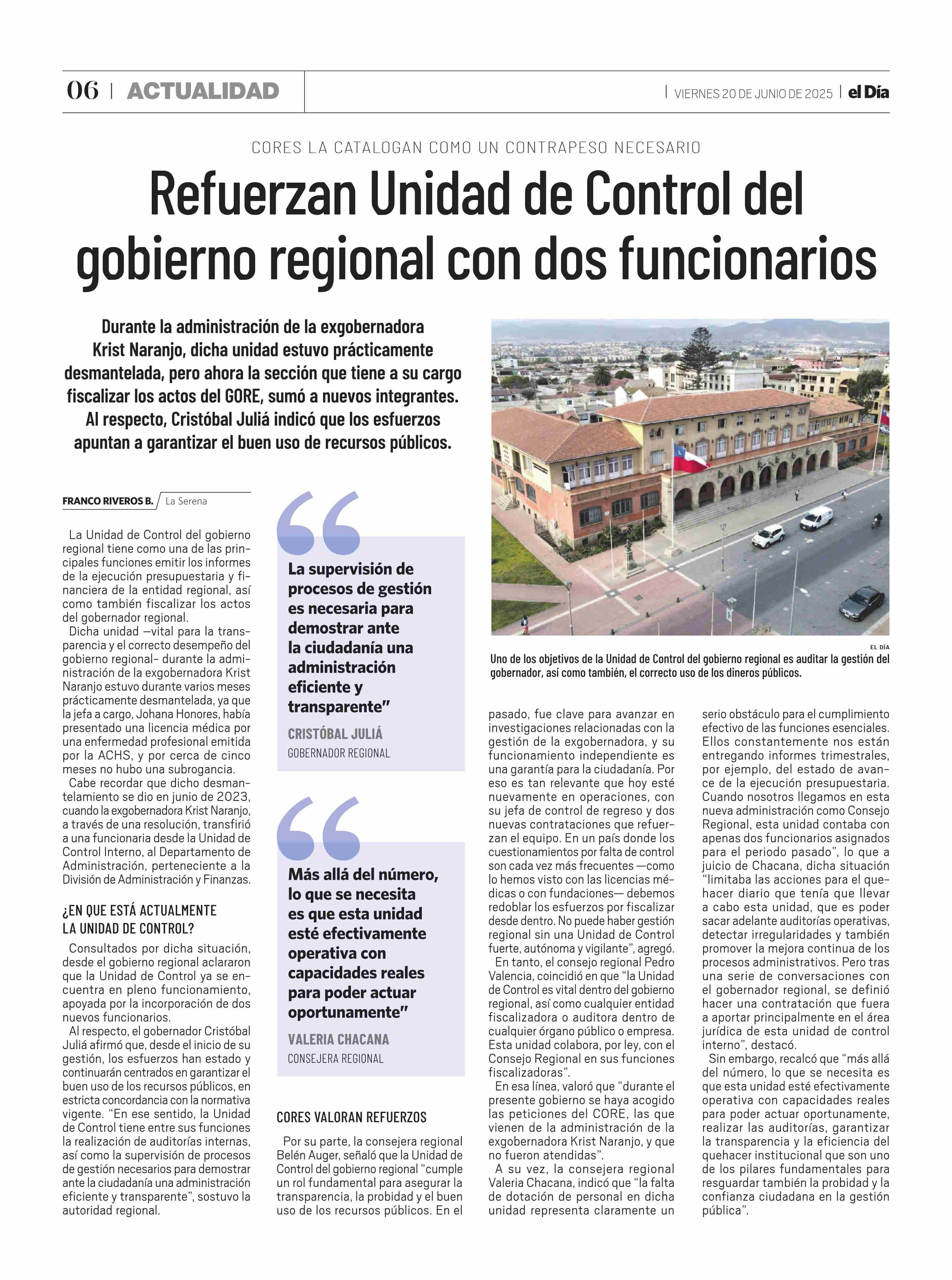 Refuerzan Unidad de Control del gobierno regional con dos funcionarios 20-06-2025 El Día |